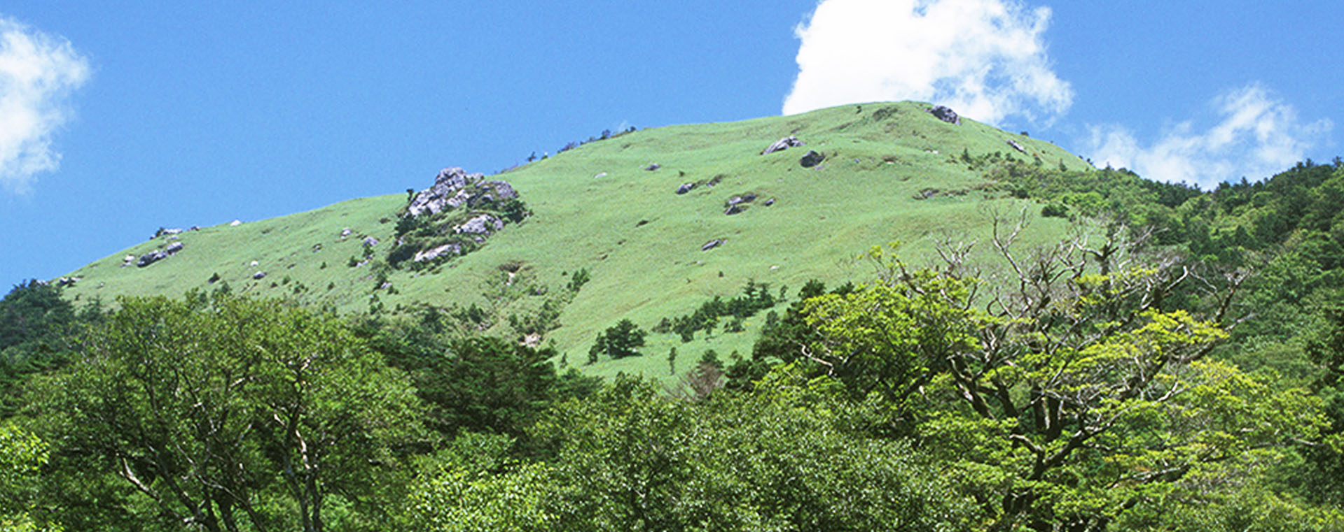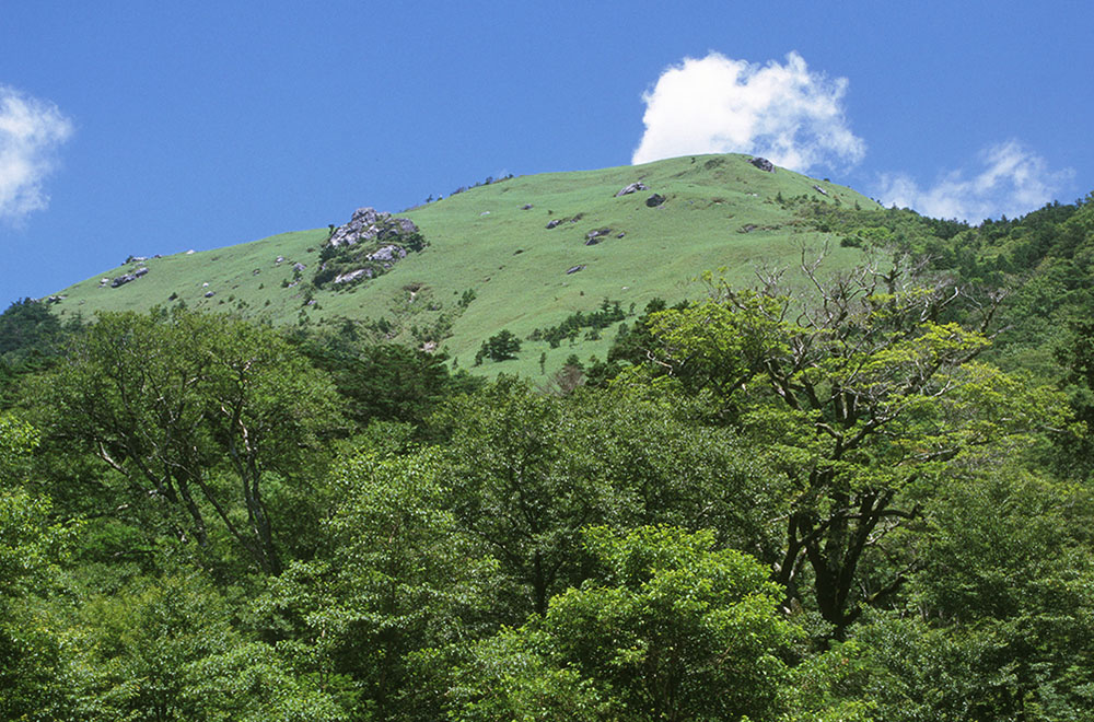 山頂付近には、笹原のじゅうたんが広がり、頂上北側の大岩からは間近に三嶺、遠くに剣山、眼下には西熊渓谷を一望できる。