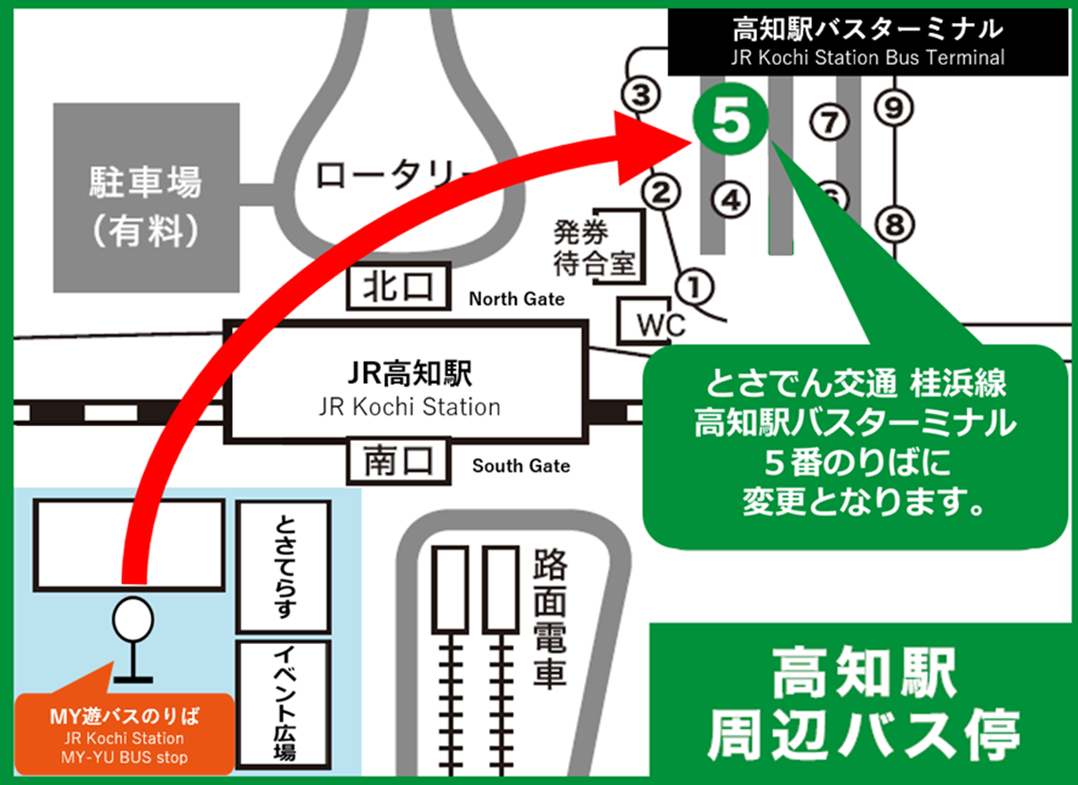 令和7年10月17日(金)~10月19日(日)は、こうち旅広場でのイベントの開催に伴い、MY遊バスのJR高知駅乗降口が下記の通り、「高知駅バスターミナル5番のりば」に変更となります。