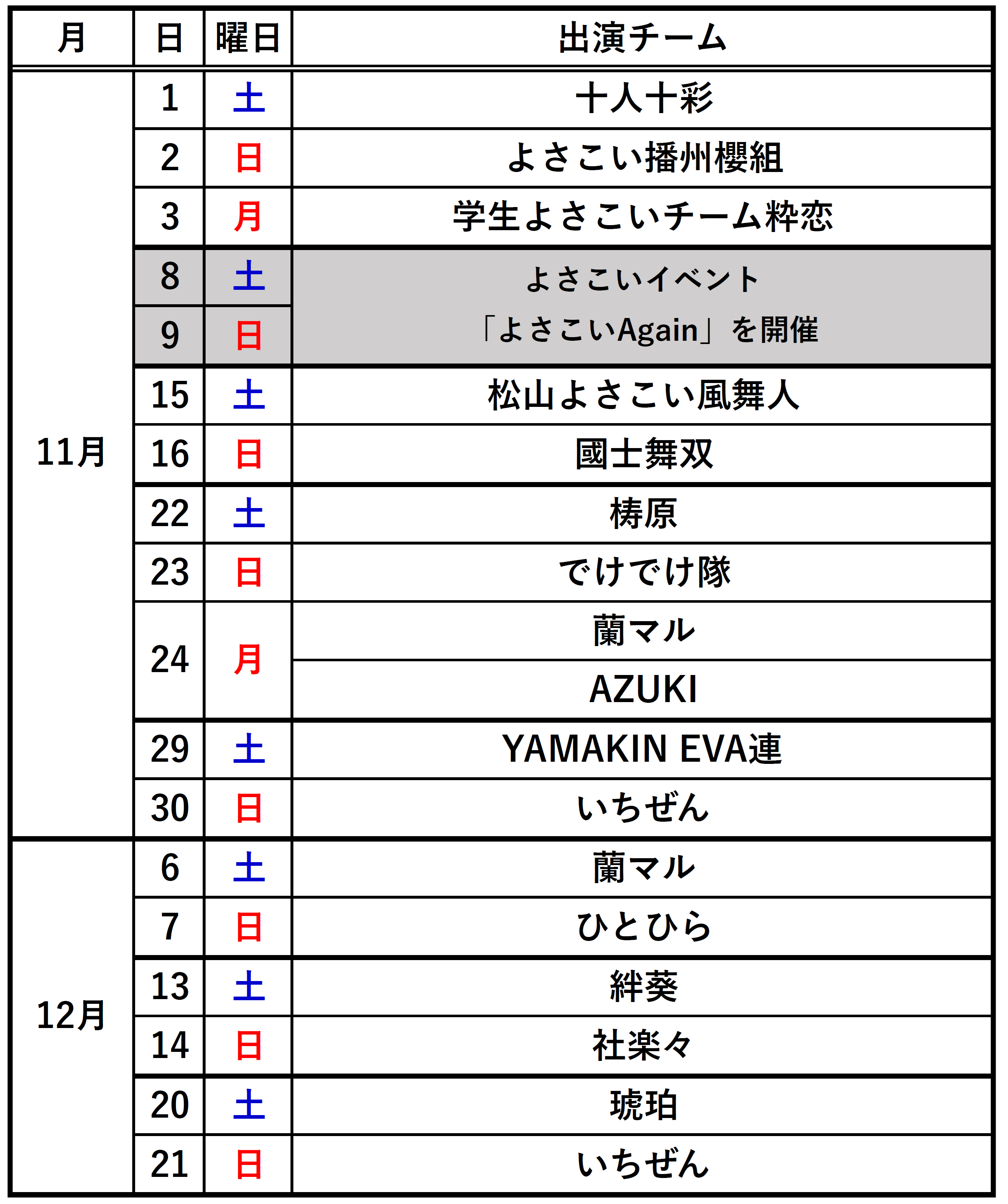下記は11・12月に演舞された出演チームの一覧です。