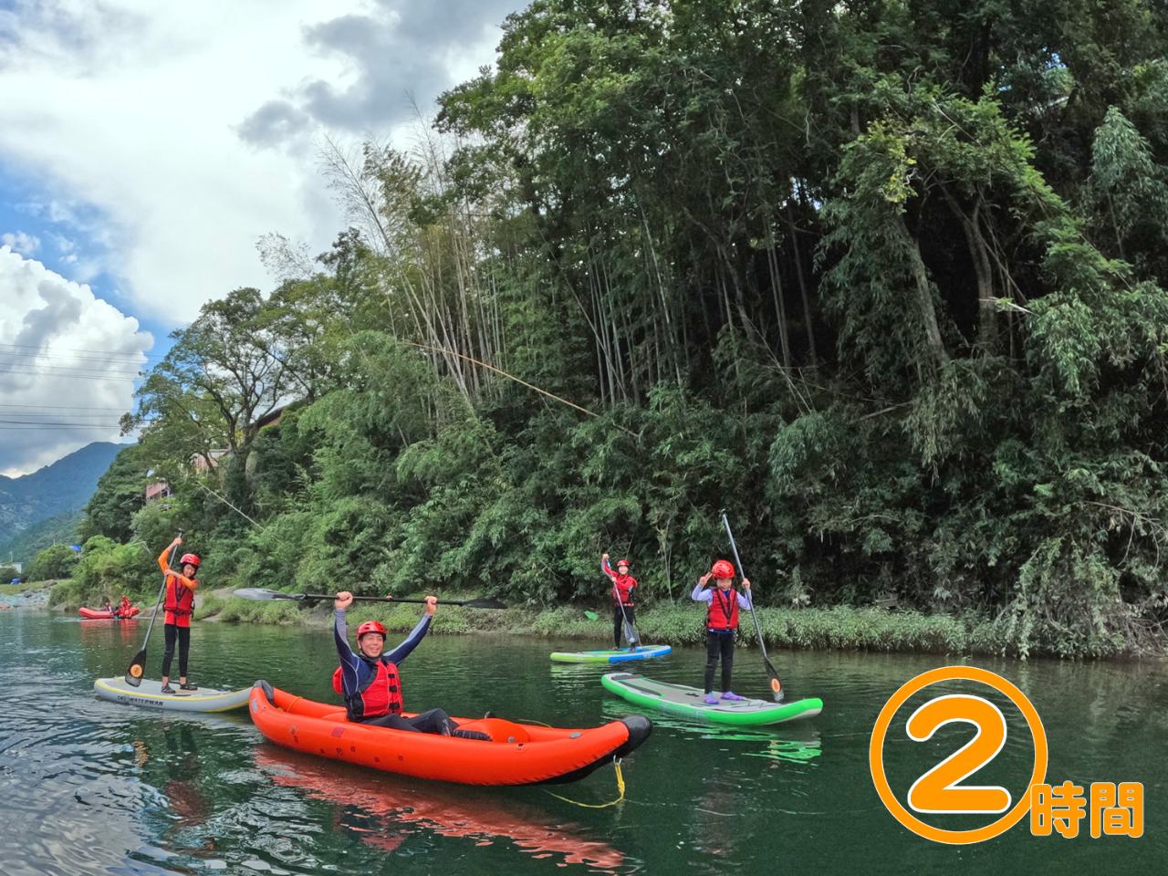 静かで涼しくなる時間帯の川をゆったり進みます。オススメは立っても座ってもできるリバーSUP。親子2人乗りもご用意できます。
