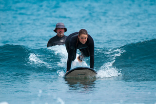 初めてのサーフィンでもきちんと教われば、ほとんどの人がレッスンの中でボードに立って波に乗れるようになります。