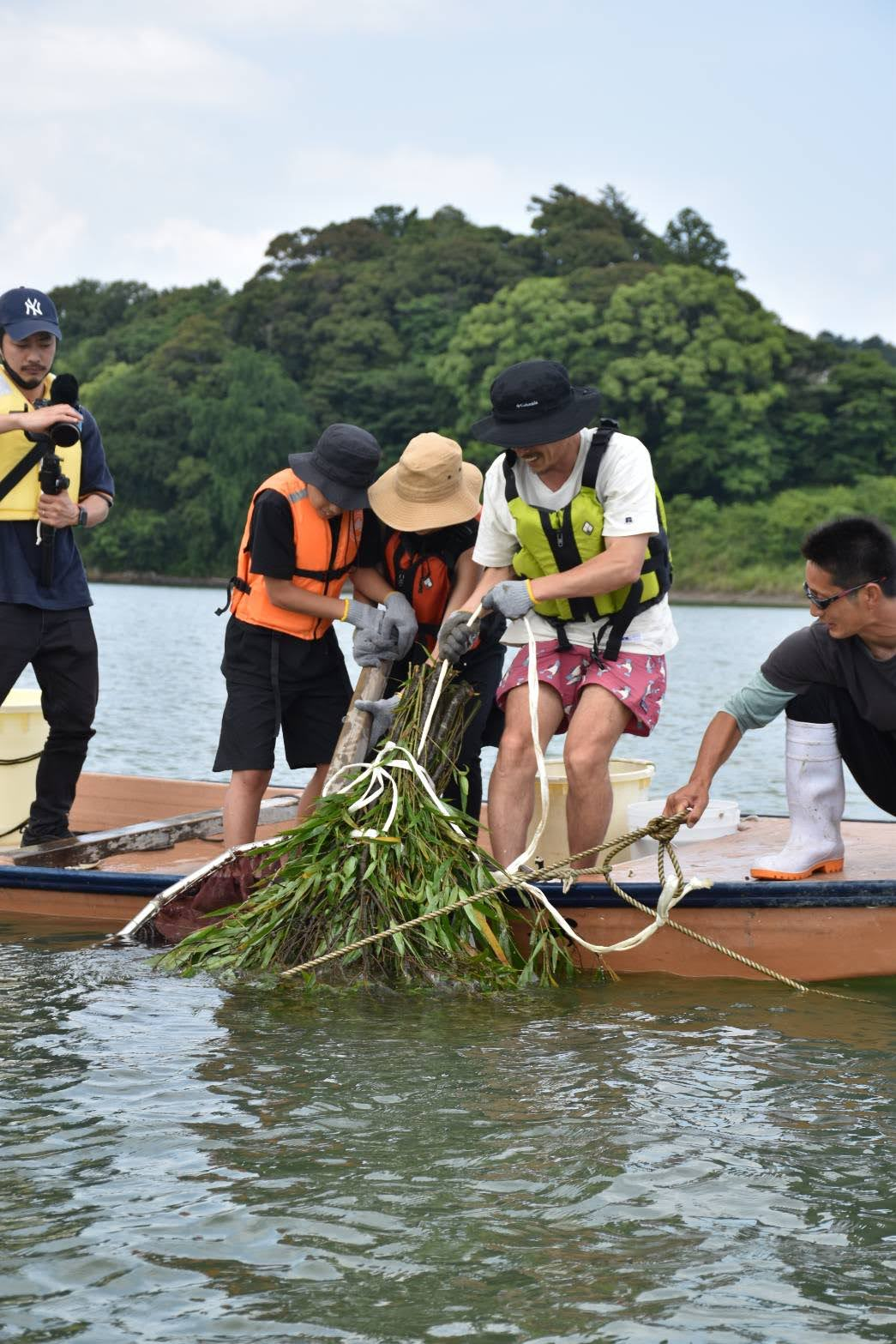 「柴漬け漁」とは、川底に沈めてある「柴(枝)」を束ねたものを引き上げ、その中にいる獲物を大きな網にふるい出して捕る伝統漁法。