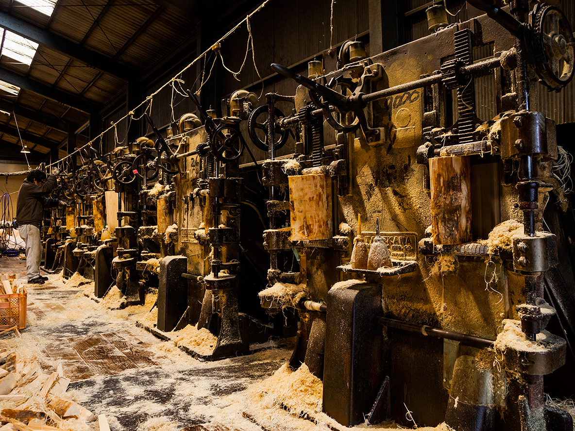 日本最後のもくめん屋で、歴史ある製造機の動きと音、そして木の香りを体験してみてください