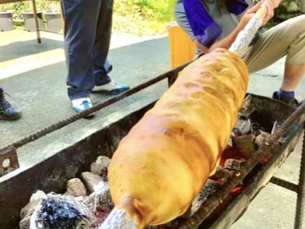 炭火の上でくるくる♪バームクーヘン作りはチームワークが試されます!