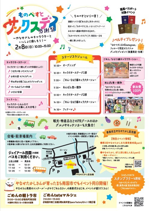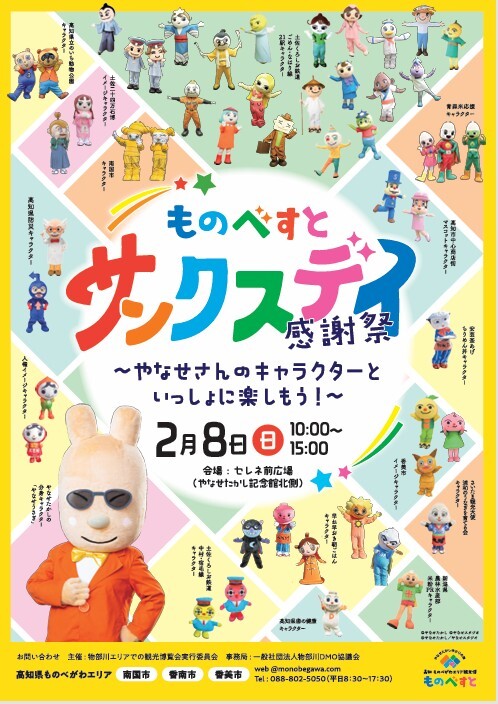 やなせたかしさんが作ったキャラクターが一堂に集い、高知県物部川流域(南国市・香南市・香美市)のエリアの魅力発信を支えてくださったすべての方へ感謝を伝え、未来へつなぐ観光博「ものべすと」クロージングイベントです。
