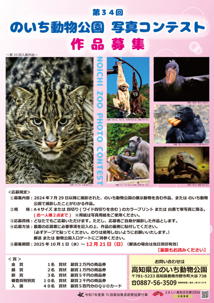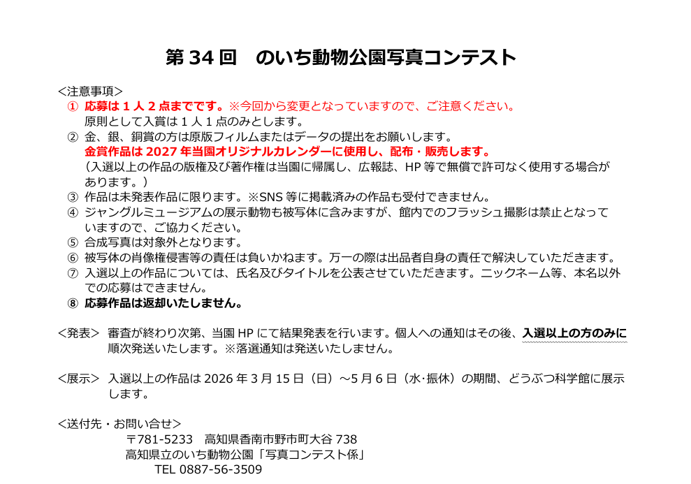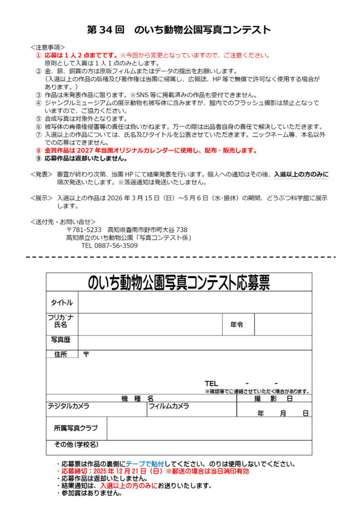 【高知県立のいち動物公園】第34回 のいち動物公園 写真コンテスト作品募集
