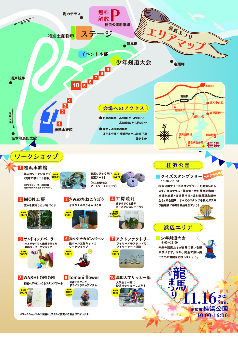 桂浜公園全体がイベント会場となり、ワークショップやクイズスタンプラリー、祭りを盛り上げるステージイベントなどが行われ、桂浜で家族みんなで楽しめる1日となっています。
