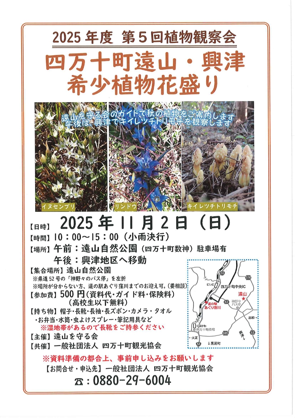 持ち物:帽子、長靴、長袖、長ズボン、カメラ、タオル、お弁当、水筒、虫よけスプレー、筆記用具など。