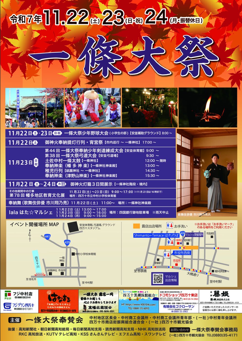 四万十町一條大祭は、「土佐の小京都 中村」の礎を築いた戦国武将・土佐一條氏の遺徳を偲び、秋の大祭に合わせて毎年11月22日から24日の3日間、盛大に開催されます。一條神社建設以来160年以上続く伝統あるお祭りで、土佐の三大祭りの1つ。