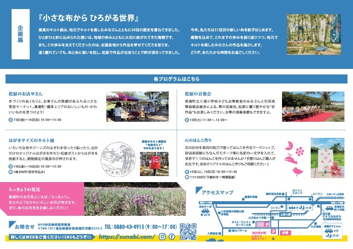 一針、一針想いのこもったキルトと自然とが織りなす風景や、松原の緑、らっきょうの赤紫色。芸術と自然が調和した、心温まる秋の砂浜美術館をごゆっくりとお楽しみください。