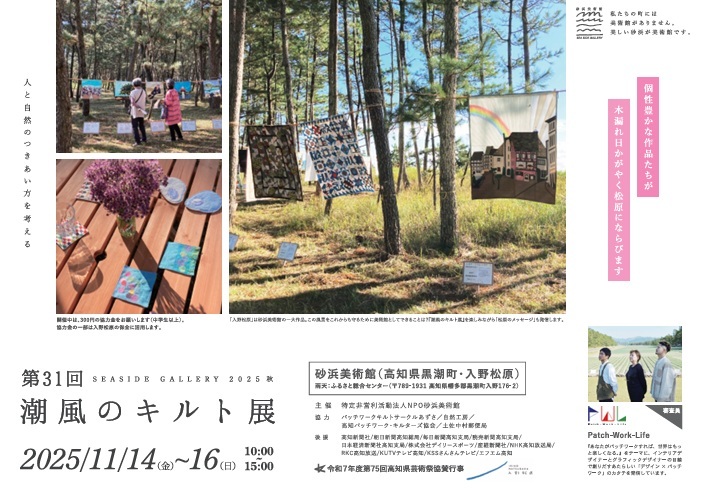 今回で31回目を迎える潮風のキルト展。今年も「布を楽しむ」をテーマに集まった、個性豊かなパッチワークキルトやクッションが砂浜沿いの松原にずらり…木漏れ日を浴びてキルトが潮風にゆらゆらとそよぐ風景は、秋の砂浜美術館の代表作品です。