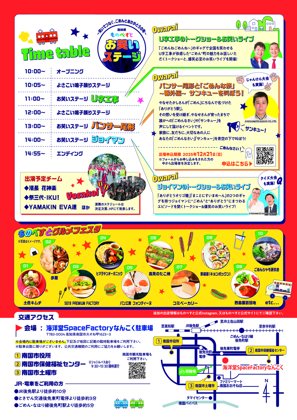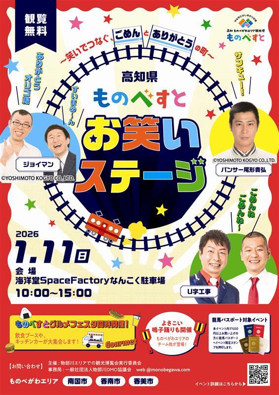 やなせたかしさんゆかりの地である物部川エリア(香美市・南国市・香南市)の魅力を県内外に発信するため、「ごめん」と「ありがとう」をテーマに、「ものべすとお笑いステージ」を1月11日(日)に海洋堂SpaceFactoryなんこくにて開催します。