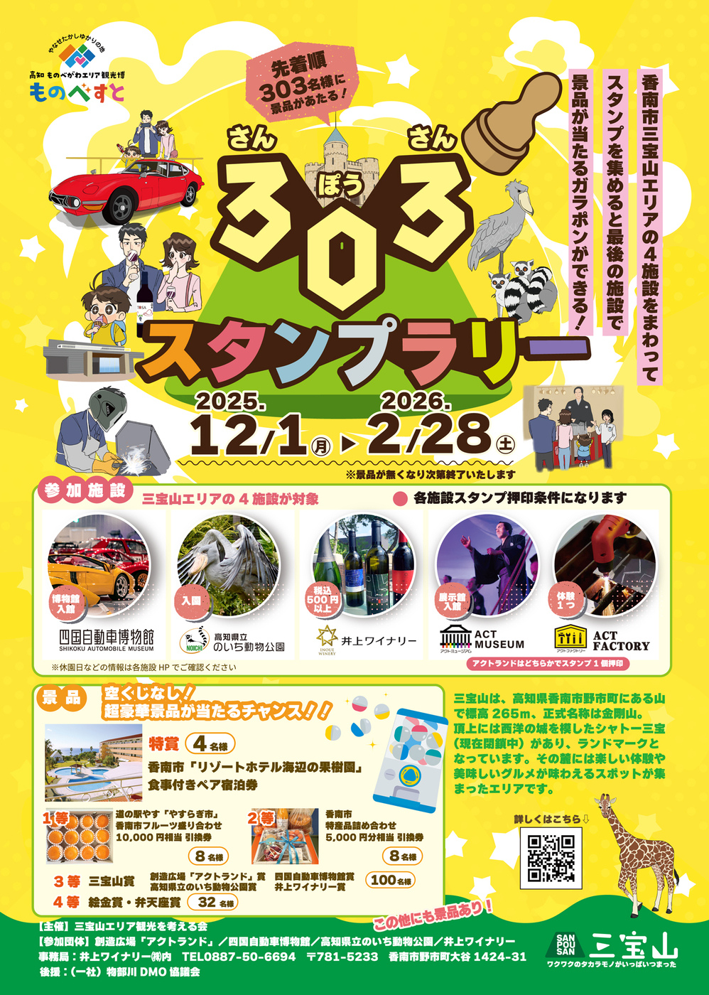 香南市三宝山エリアの【四国自動車博物館】【高知県立のいち動物公園】【井上ワイナリー】【創造広場「アクトランド」(アクトミュージアムorアクトファクトリー)】の4施設をまわってスタンプを集めると、最後にスタンプを押した施設でそのまま景品が当たる、ガラポンに挑戦できるスタンプラリーを開催します。(※景品がなくなり次第終了いたします)