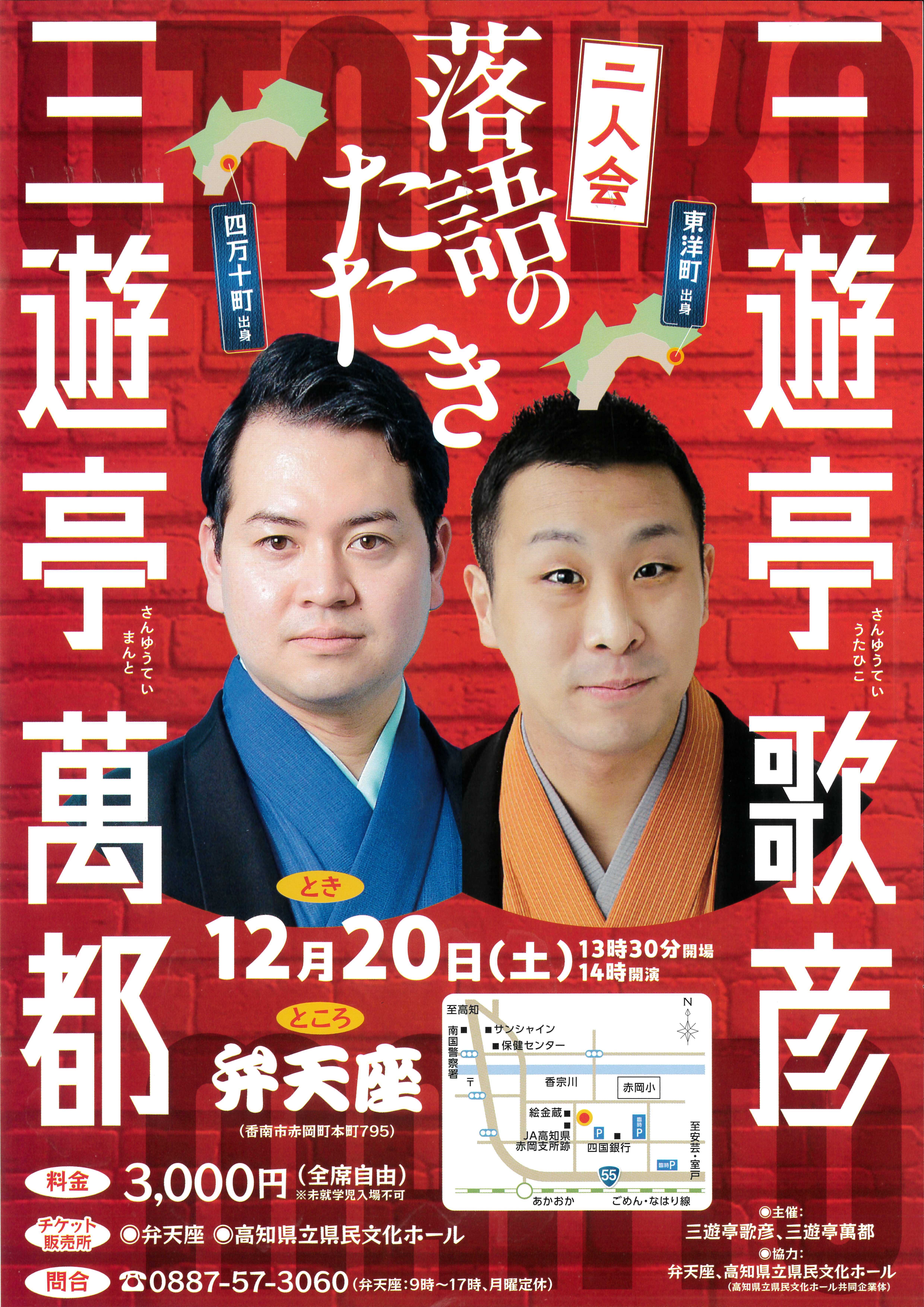 香南市の弁天座にて、高知県出身の噺家 三遊亭歌彦さん(東洋町/二ツ目)、三遊亭萬都さん(四万十町/二ツ目)による二人会を今年も12月20日に開催します。