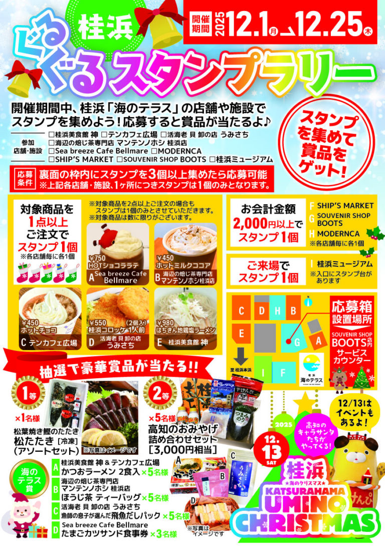 開催期間中、桂浜 海のテラスの店舗や施設でスタンプを集めよう!応募すると、賞品が当たります♪