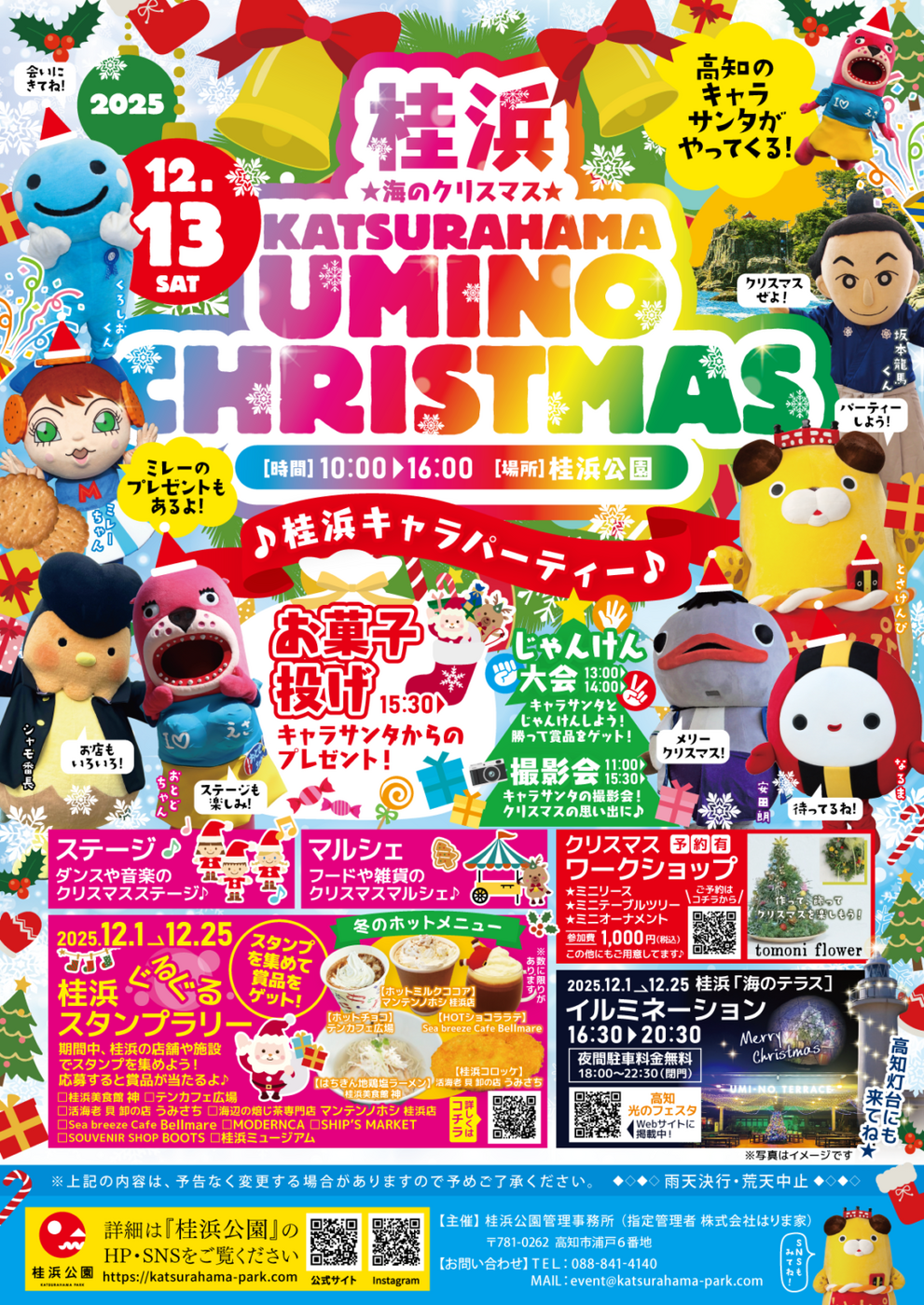 クリスマス仕様に変身した、ご当地キャラクターたちが集まり、お菓子投げやじゃんけん大会、桂浜キャラパーティーなど盛りだくさん!