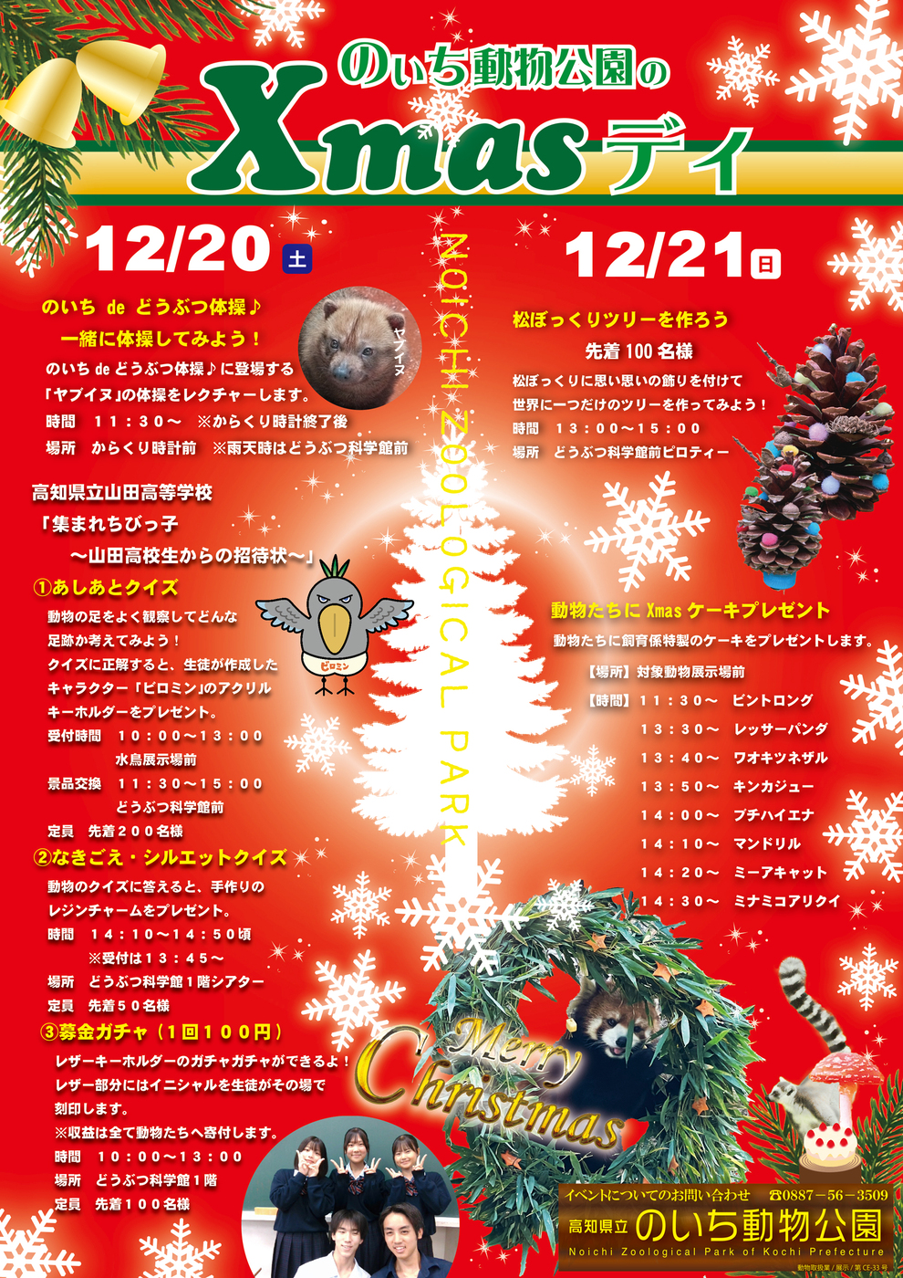 12月20日(土)は、のいちdeどうぶつ体操♪や、県立山田高等学校による「集まれちびっ子~山田高校生からの招待状~」(あしあとクイズ、なきごえ・シルエットクイズ、募金ガチャ)、12月21日(日)は、松ぼっくりツリー作りや動物たちにXmasケーキプレゼントを開催します!