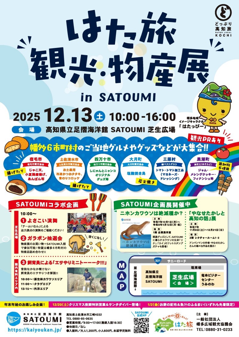 SATOUMIでは12月13日(土)10:00より、幡多6市町村のご当地グルメやグッズが集合する「はた旅 観光・物産展 in SATOUMI」を開催いたします。