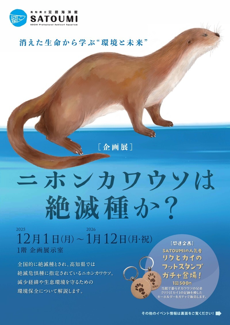 全国的に絶滅種とされ、高知県では絶滅危惧種に指定されているニホンカワウソ。減少経緯や生息環境を守るための環境保全について解説します。会場では関連グッズとして、当館で暮らすユーラシアカワウソの兄弟「リク」と「カイ」のフットスタンプガチャも登場します。期 間:2025年12月1日(月)~2026年1月12日(月・祝) 9:00~17:00(最終入館16:30)