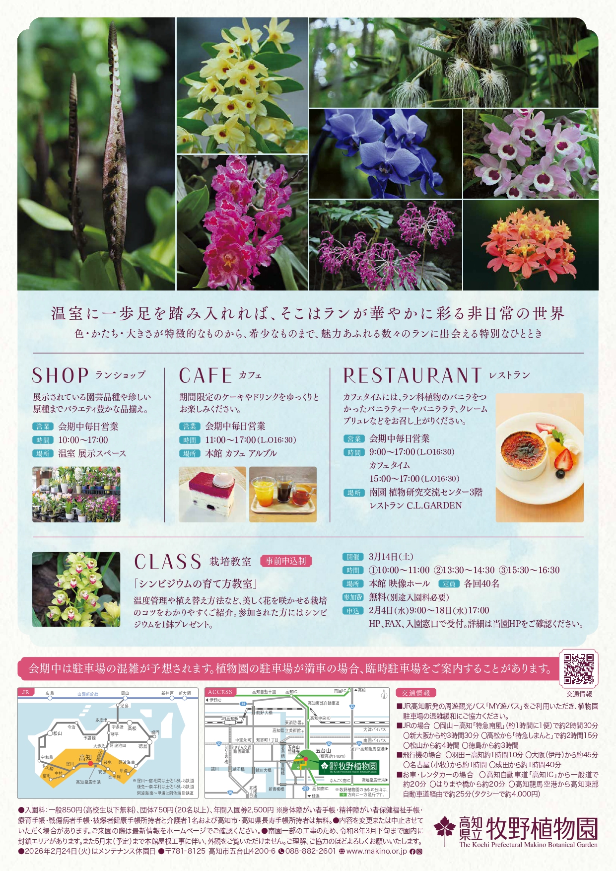 ●催しの開催状況により、駐車場の混雑が予想されます。駐車場の最新情報は、当園のホームページでご確認ください。