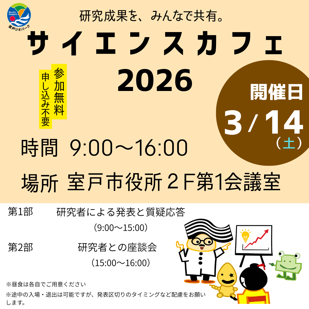室戸ジオパークをテーマに研究を行う研究者が、その成果を市民に向けて発表し、直接対話できる公開型の学術イベントです。