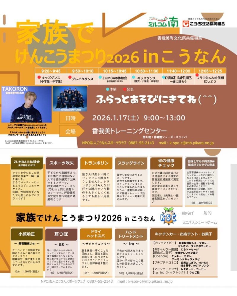 「家族でけんこうまつり2026 inこうなん」を1月17日(土)に、香我美トレーニングセンターにて開催いたします。トランポリン、スポーツ吹き矢、キッズダンス、ブレイクダンス、フラダンスなどの体験は、こうなんスポーツクラブにて行います!