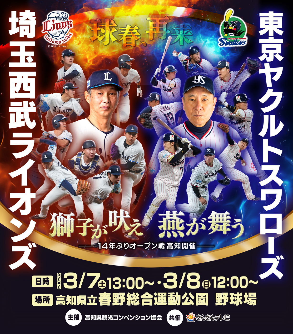 実に14年ぶりとなる2026プロ野球オープン戦、埼玉西武ライオンズVS東京ヤクルトスワローズの試合を、3月7日(土)・8日(日)の2日間、高知県立春野運動公園野球場にて開催します。
