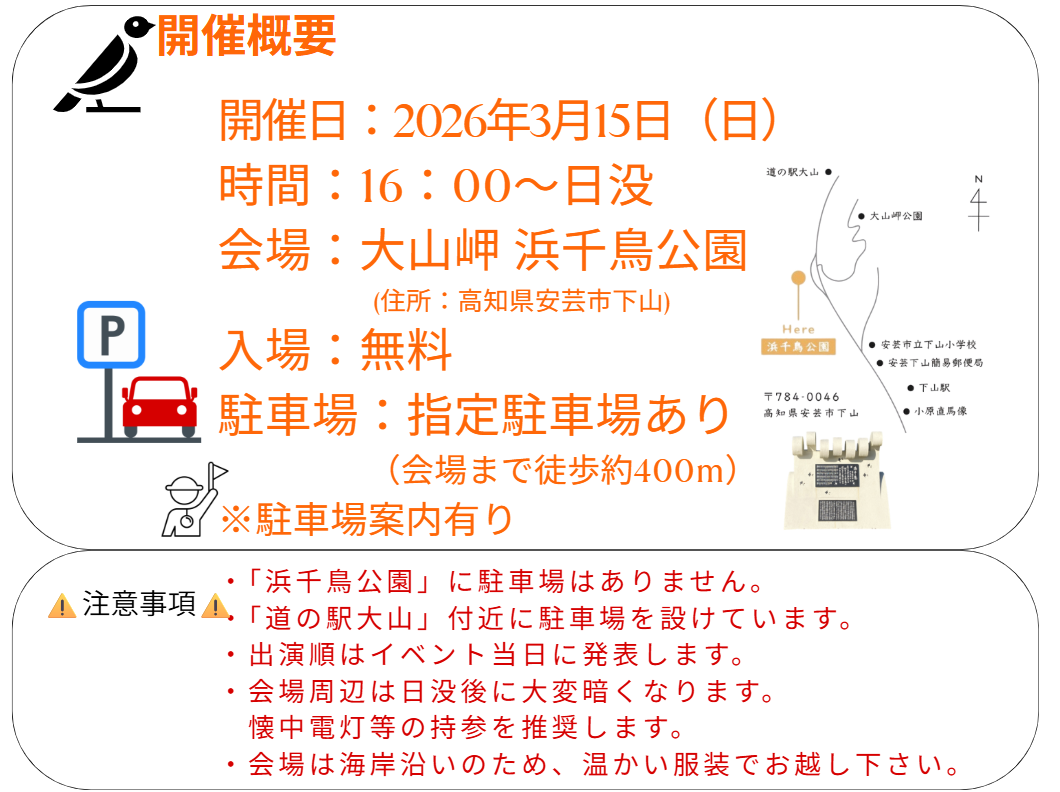 ※雨天及び強風など、悪天候により浜千鳥公園での開催が難しいと判断した場合は、会場を「伊尾木公民館」に変更して開催します。
