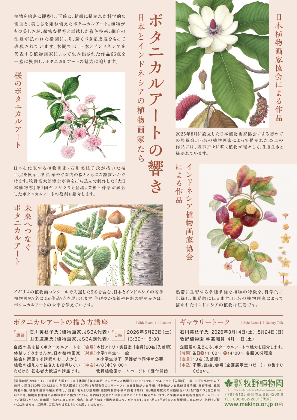 本展では、華やぐ園内の桜とともにご鑑賞いただける桜のボタニカルアートをはじめ、日本とインドネシアを代表する植物画家によって生み出された66点の作品を一堂に展開し、ボタニカルアートの魅力に迫ります。