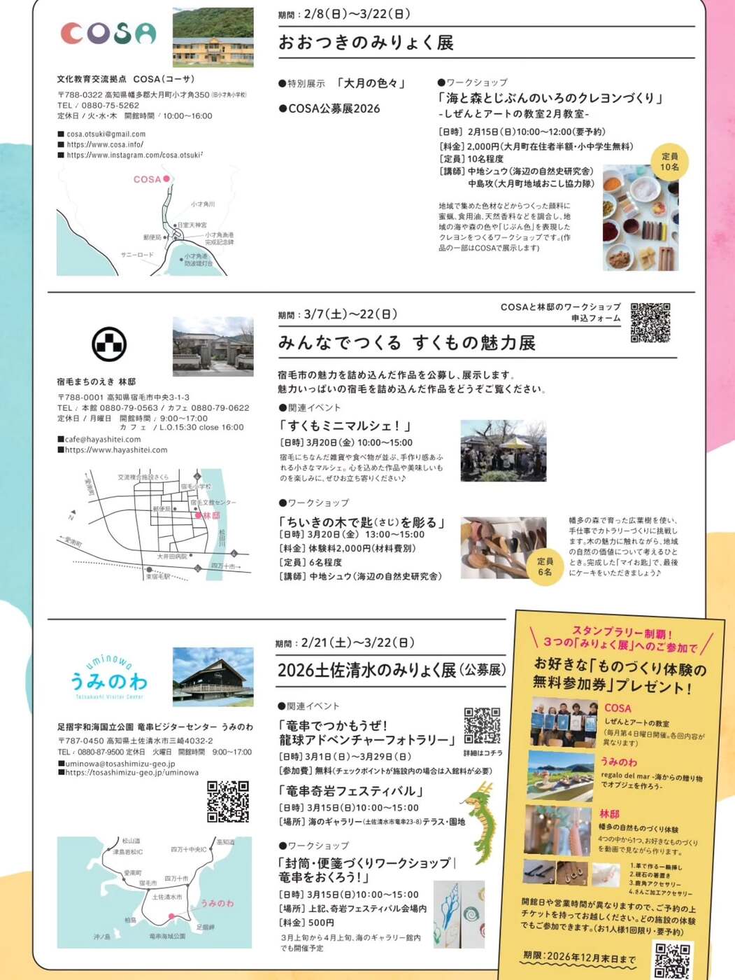 今回も大月町COSA、土佐清水市うみのわ、宿毛市まちのえき林邸、それぞれの施設で公募によって集めた地域の魅力満載の作品が並びます。