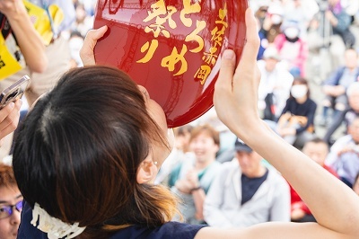 男性・女性ともに五合(0.9L)を一気に飲み干し、飲み干す時間と飲みっぷりの総合得点を競う「大杯飲み干し大会」がメインイベントです。