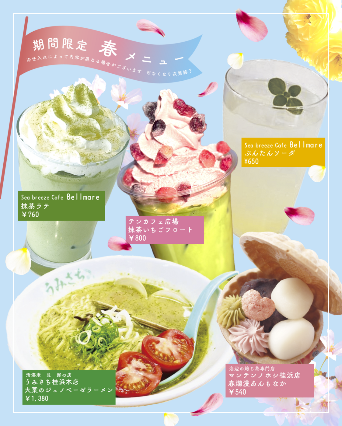 期間中、「桂浜海のテラス」には、造花をハンギングで彩った〝春風ガーデン〟や、テナントではとっておきの春限定メニューが登場し、、春を肌と舌と目で思う存分にお楽しみいただけます。