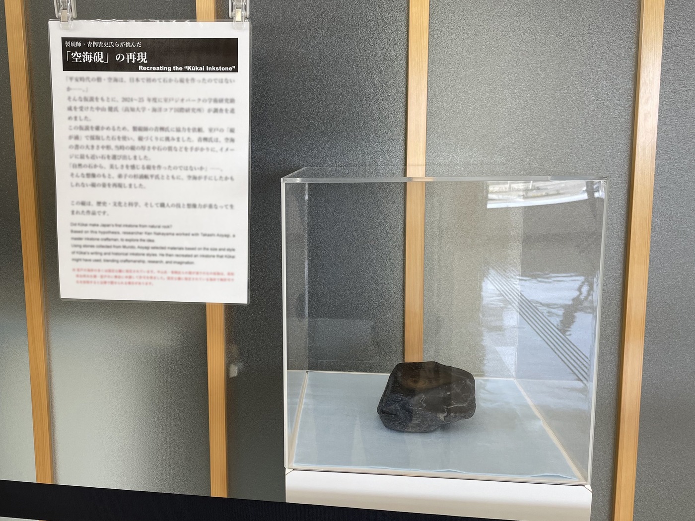 書道コンクール作品展と同時に、日本唯一の製硯師・青栁貴史氏が作成した「空海硯」を入り口付近で展示しています。