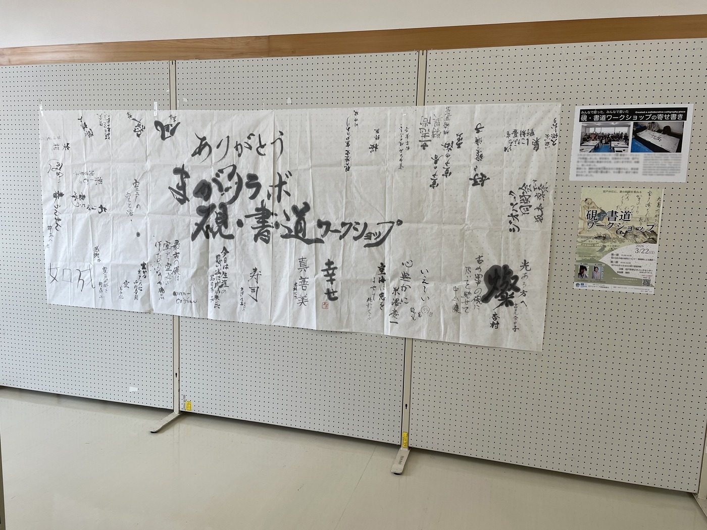 3月下旬に開催された「まがりラボ硯・書道ワークショップ」では、この空海硯を使って墨を磨り、参加者で寄せ書きもしました。