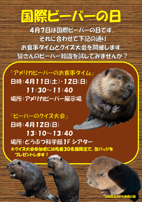 毎年4月7日は「国際ビーバーの日」です。それに伴い、国際ビーバーの日のイベントを下記の日程で行います。