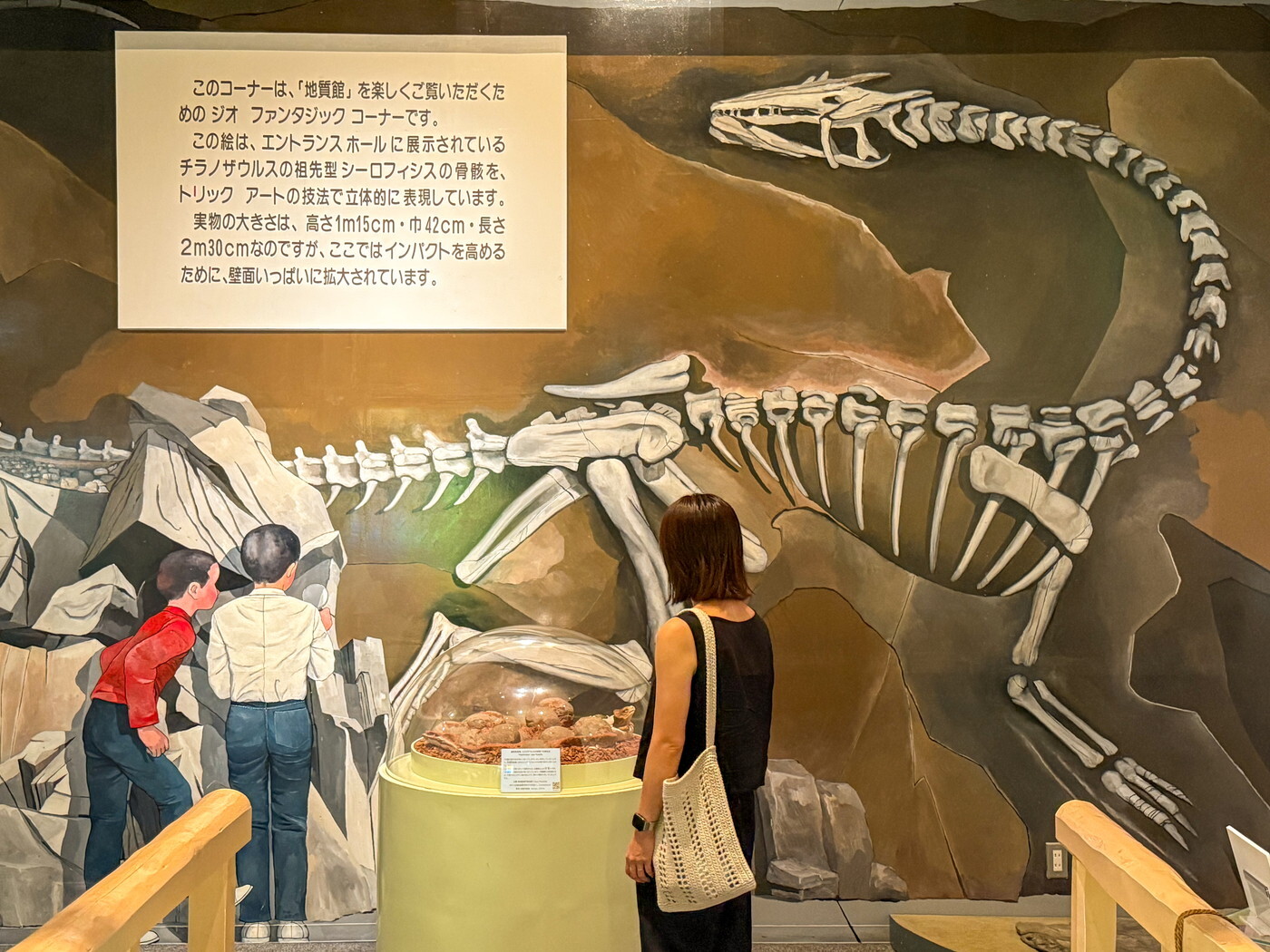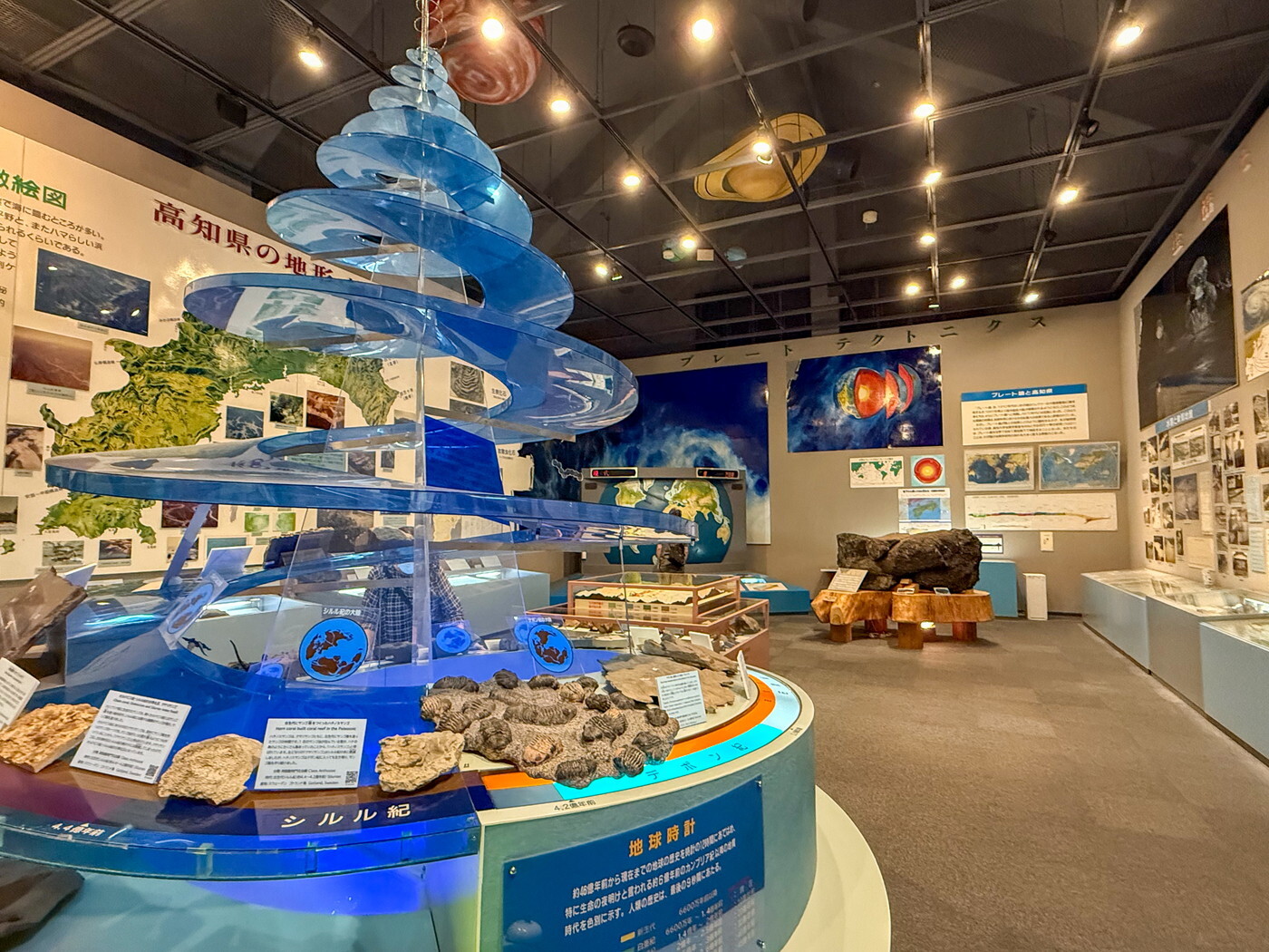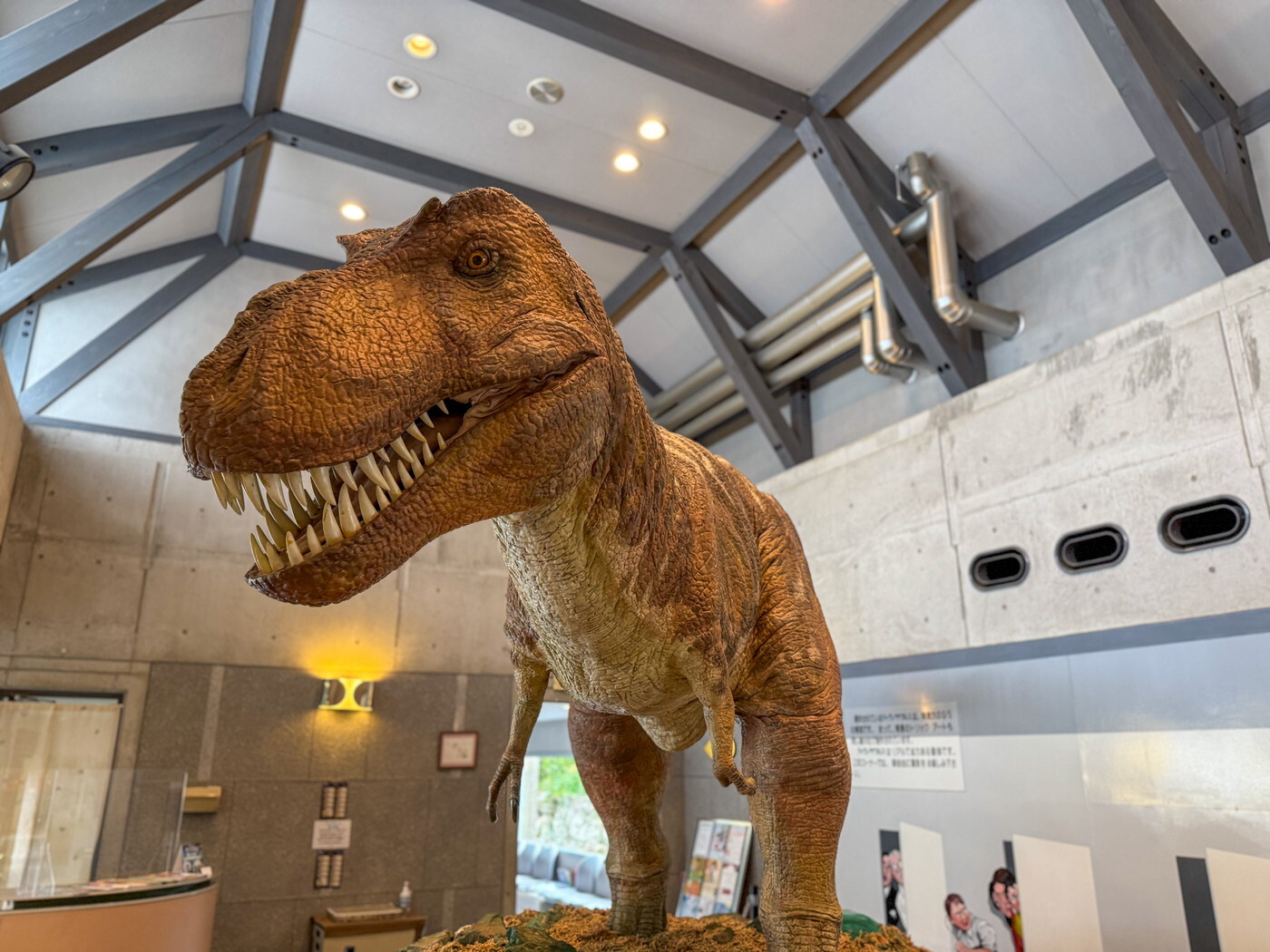 高知県佐川町の「佐川地質館」は、日本の地質学発祥の地の一つとされる佐川盆地に建つ地質・化石ミュージアムです。平成4年に開館し、ナウマン博士や小林貞一博士の研究成果とともに、動くティラノサウルス(3/5大)や世界各国の珍しい化石コレクションを展示。また、地質時代塔やプレート運動解説装置で地球46億年の歴史を体感できます。