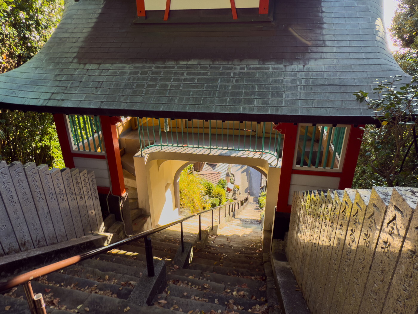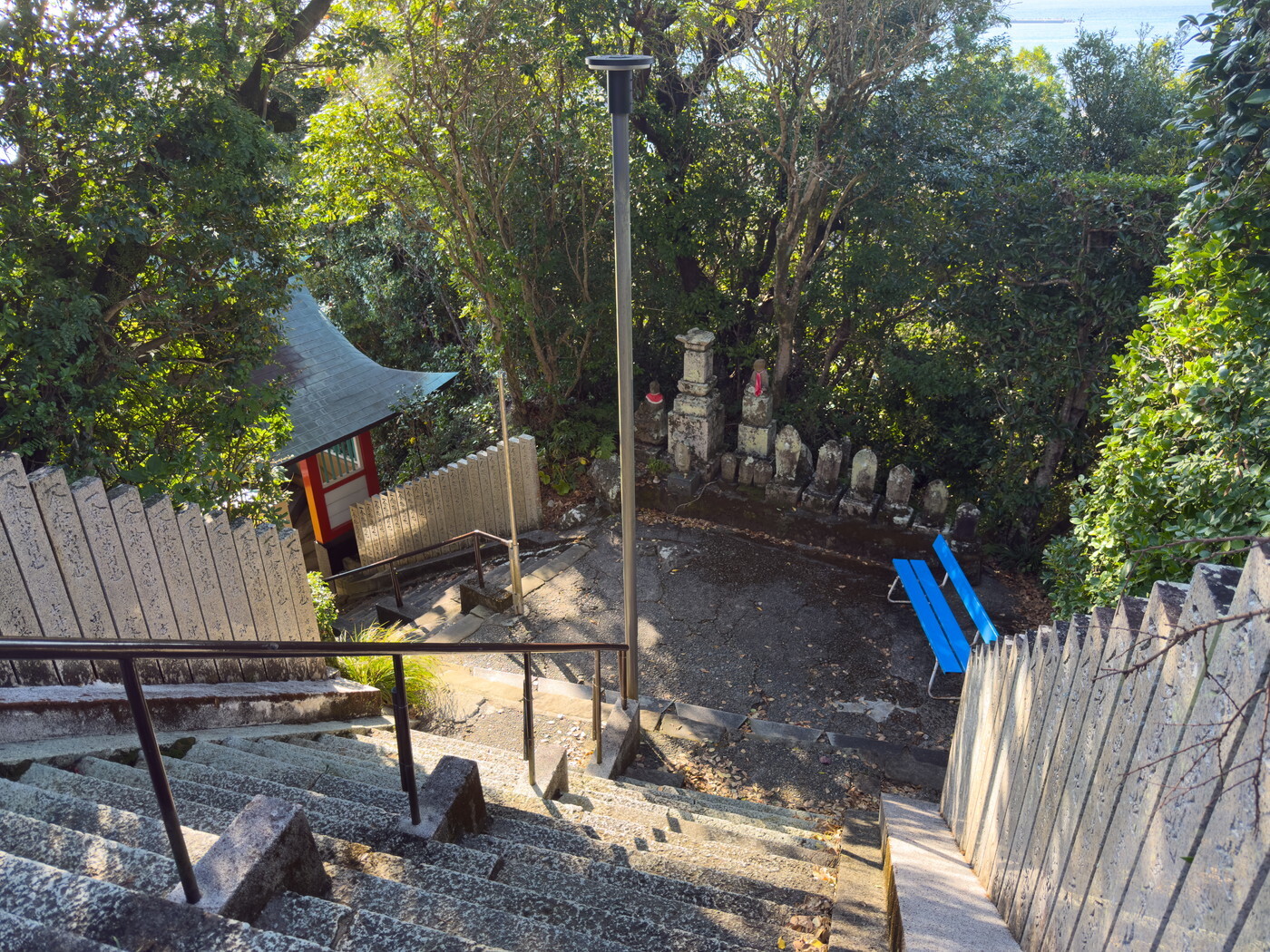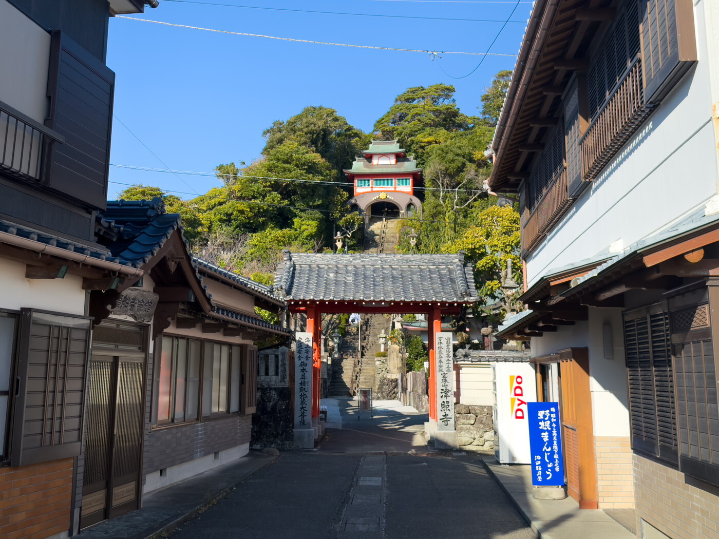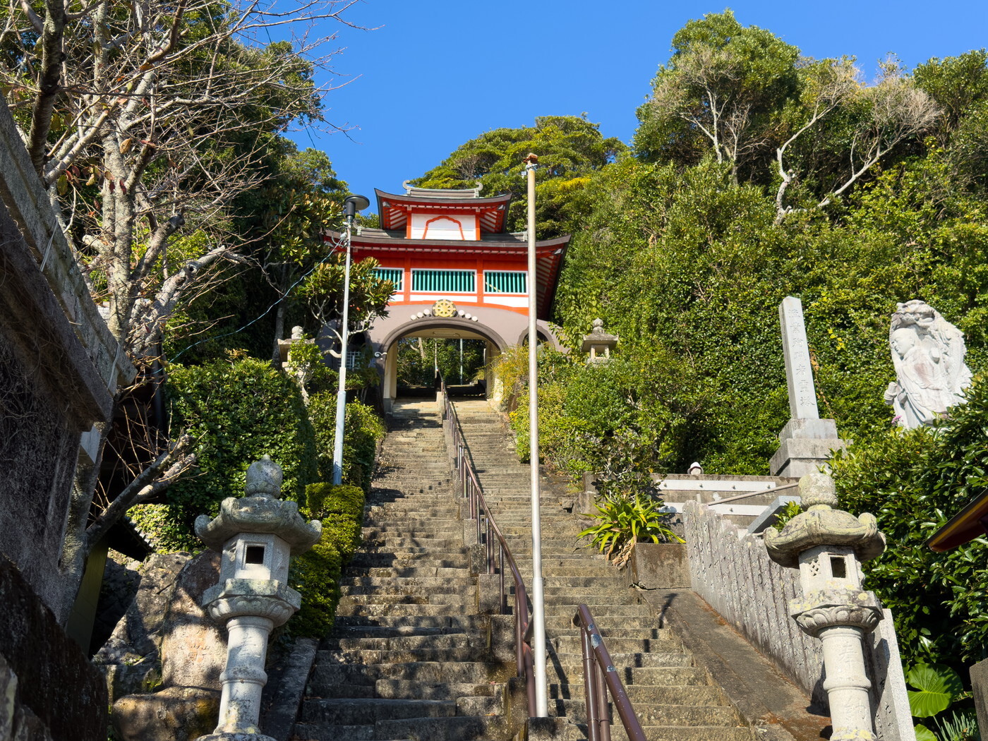 室津港を見下ろす小高い山に佇む第25番札所「津照寺」。急勾配の石段と竜宮城を思わせる朱色の鐘楼門、本堂からの太平洋の眺望が印象的な霊場です。海を守る「楫取地蔵」(かじとりじぞう)の伝説が今も息づく、四国霊場屈指の絶景スポットです。