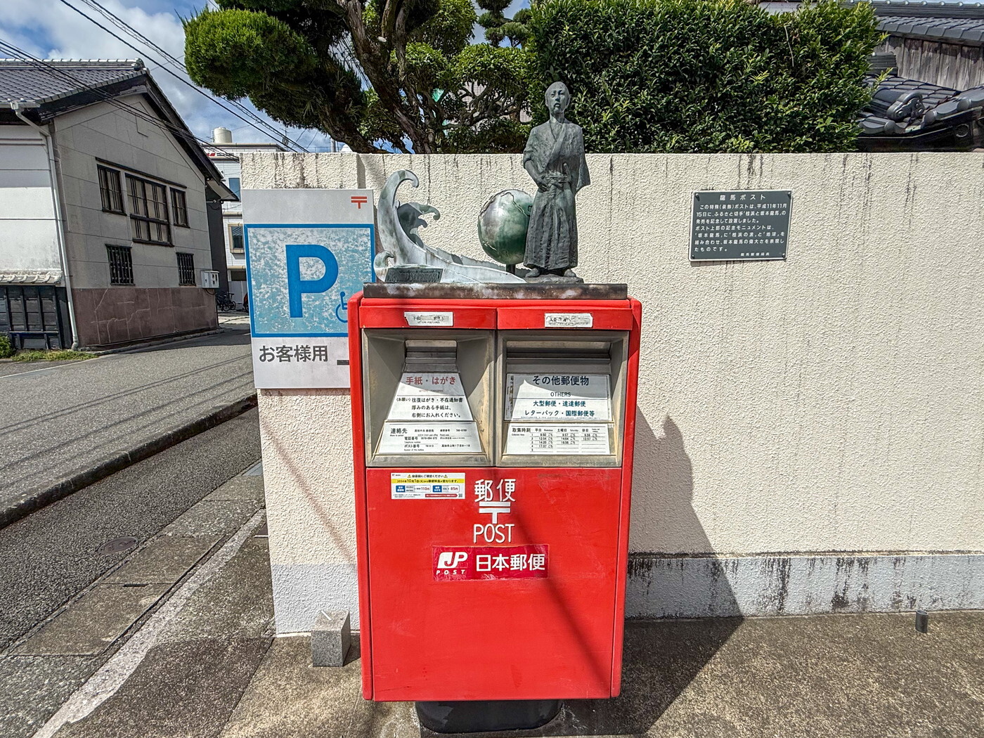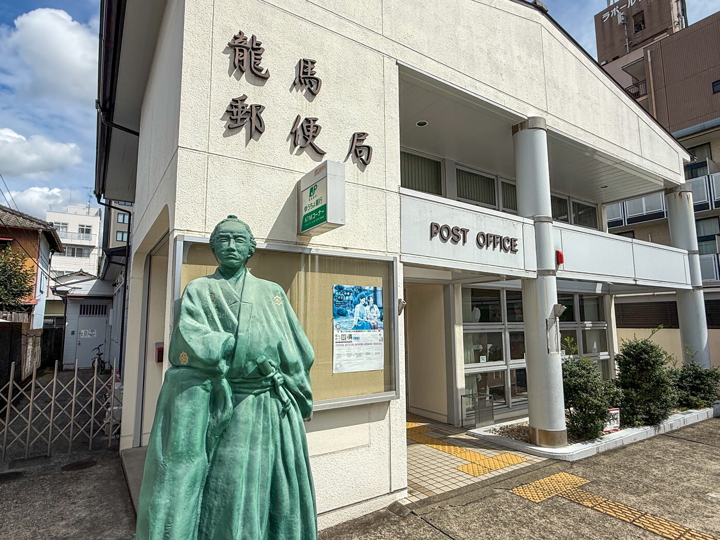 郵便局入口前には大きな龍馬像が立ち、ポストの上には龍馬と一緒に「地球」と「桂浜の波」の像がのっている。局内には龍馬関連の資料が展示され、この郵便局から郵便物を発送すると、生誕の地と龍馬の図柄が入った消印を押してもらえる。