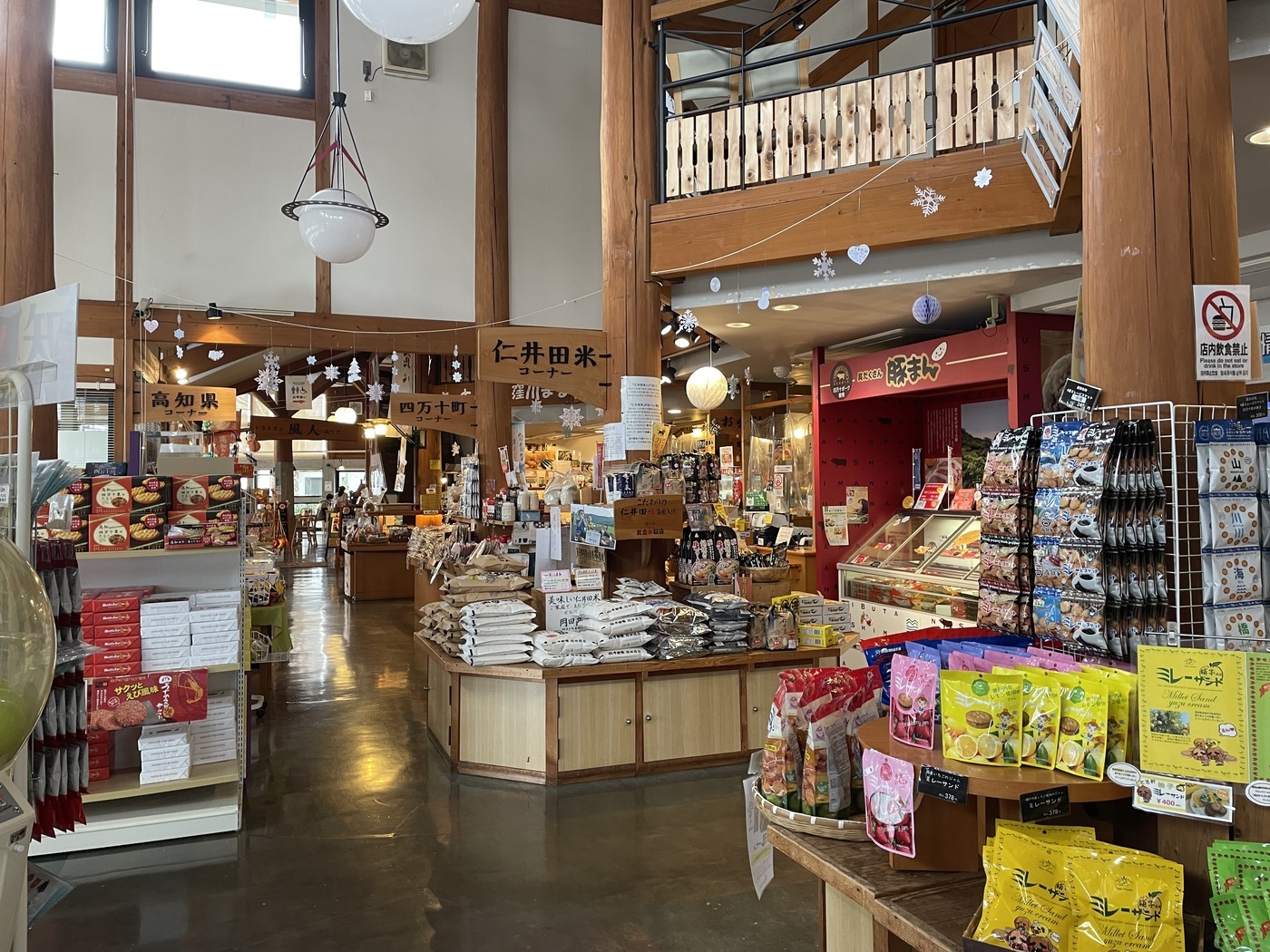 お土産コーナーでは四万十ポークや仁井田米を使った川のり、ミレービスケット、地酒などバラエティ豊かな特産品を取り揃え、県外発送も可能です。