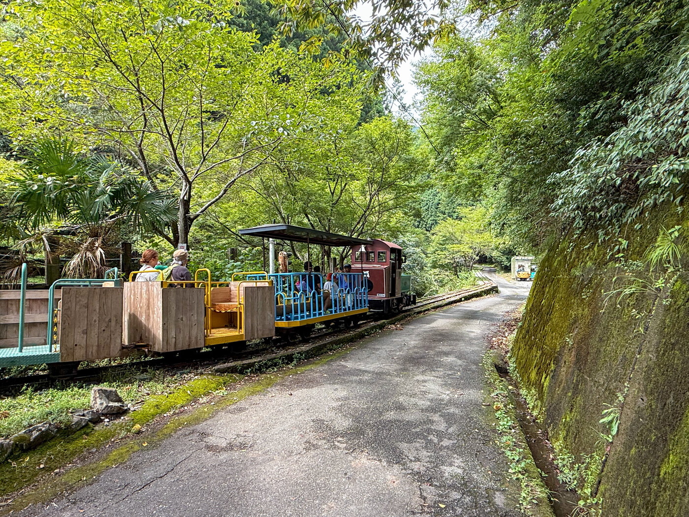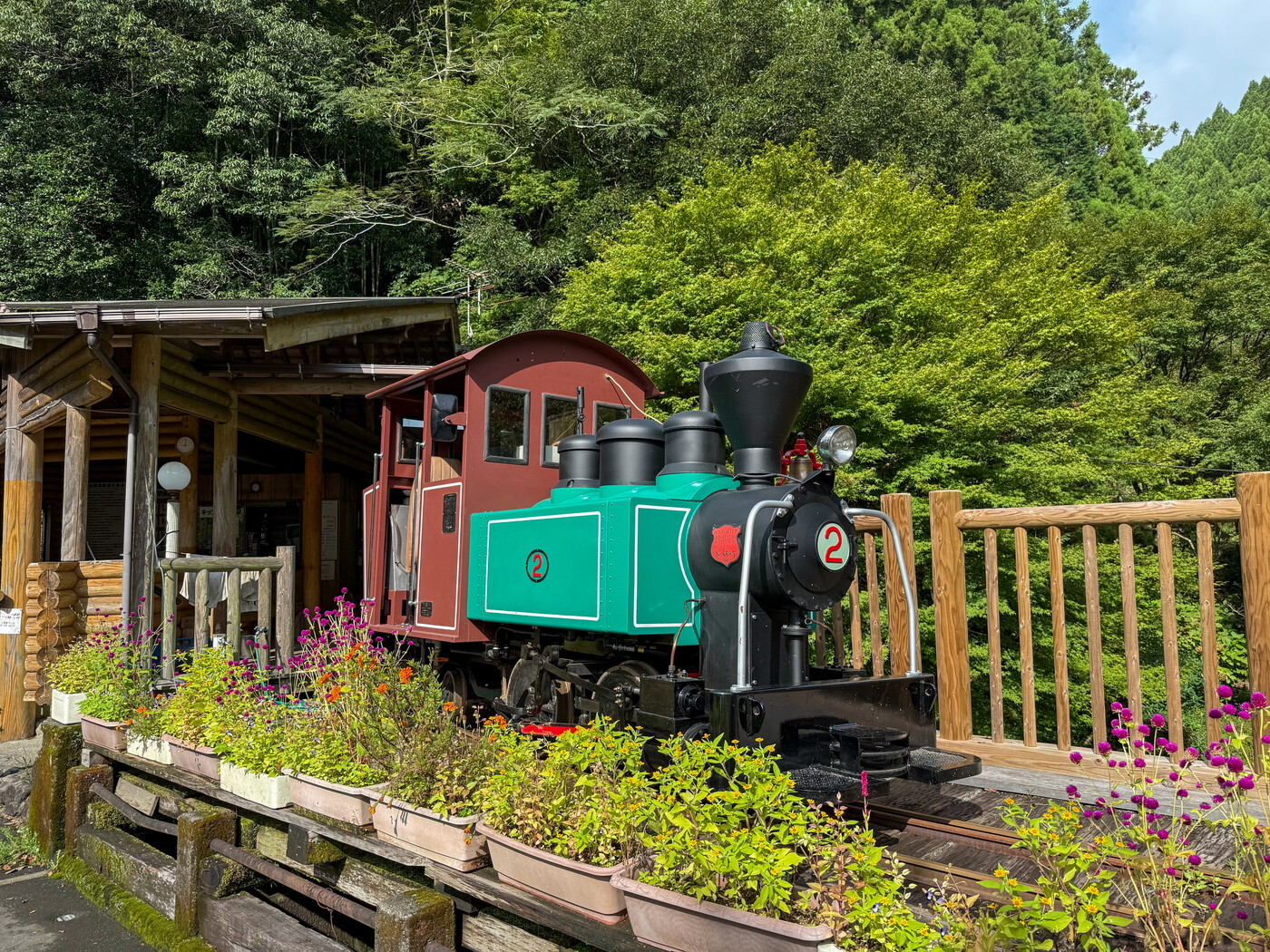 高知県馬路村の馬路温泉前で、かつて魚梁瀬杉を運んだ森林鉄道の蒸気機関車を再現した車両が走っています。昭和30年代まで実際に村内を走っていた森林鉄道の記憶を今に伝える、ノスタルジックな観光アトラクションです。