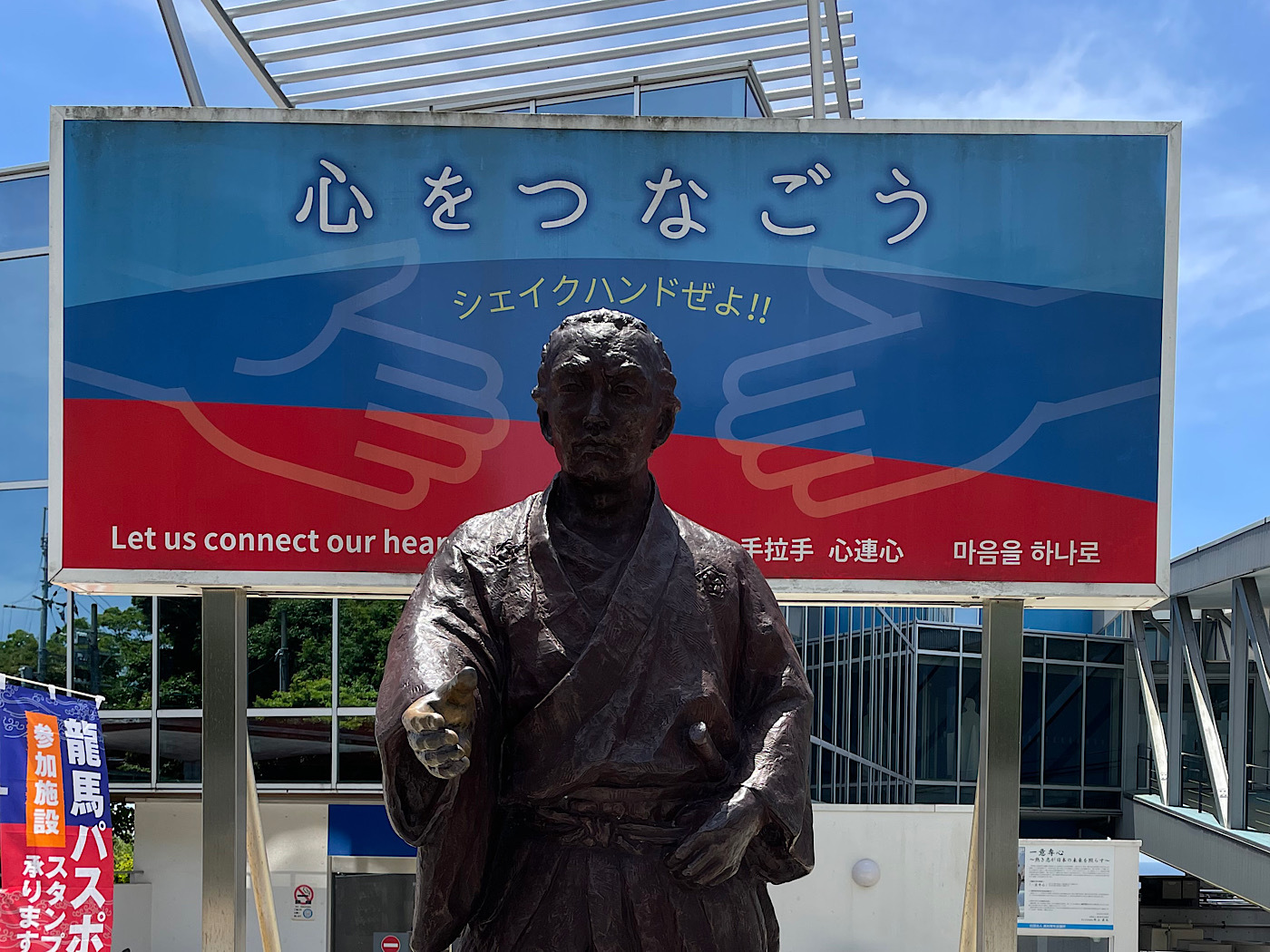 「シェイクハンド=握手」は、身分に関係なく同じ志を持つ者が協力することで平和で平等な国づくりを目指した龍馬の精神を表しています。