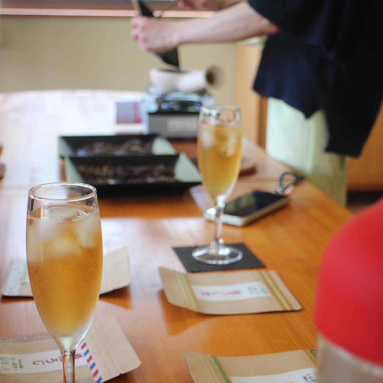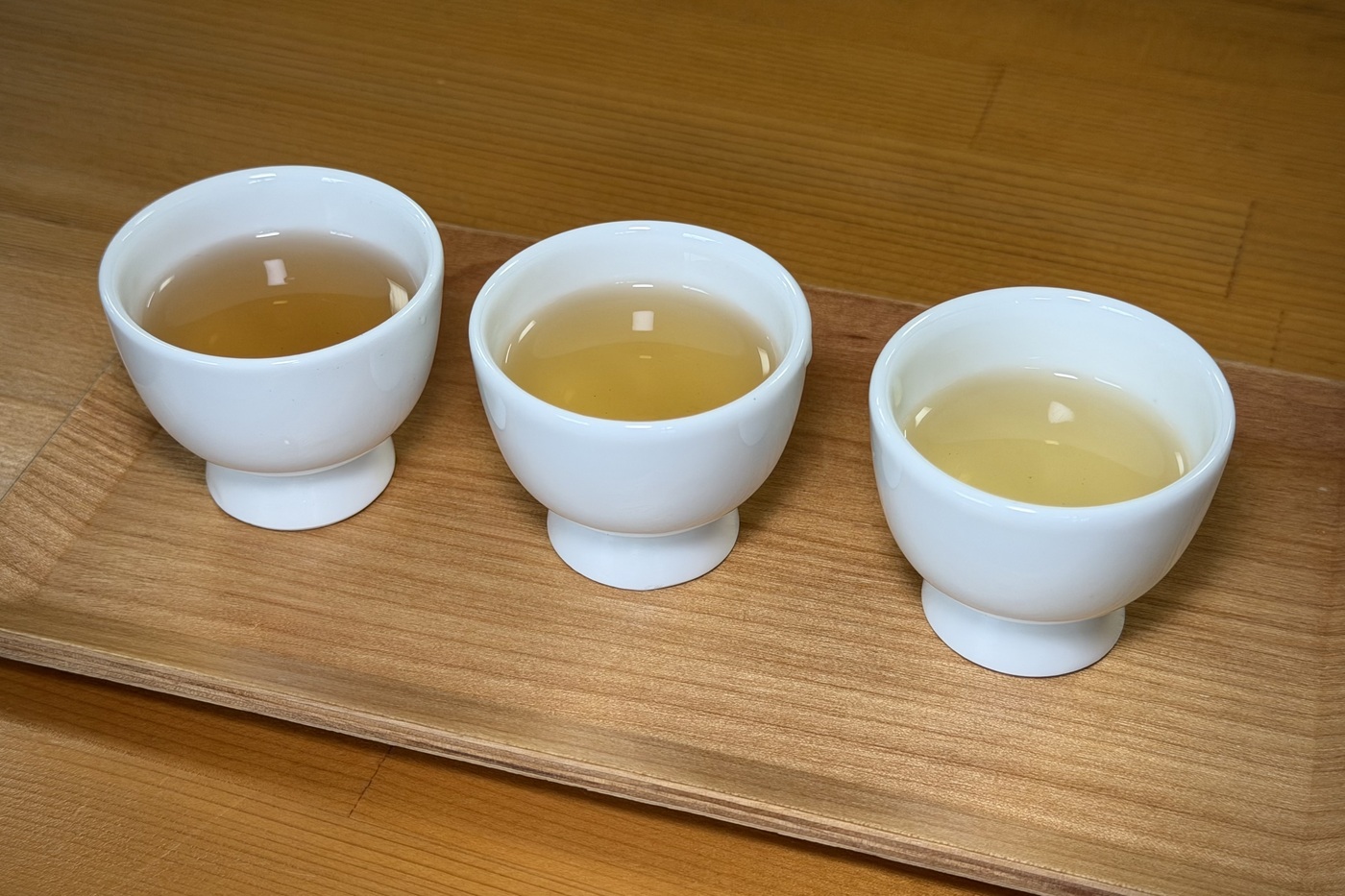 ほうじ茶焙煎体験では、まずスタッフの方が淹れてくれる「浅煎り」「中煎り」「深煎り」の煎り時間の異なる3種類のほうじ茶を飲み比べて自分の作りたい味を決めます。