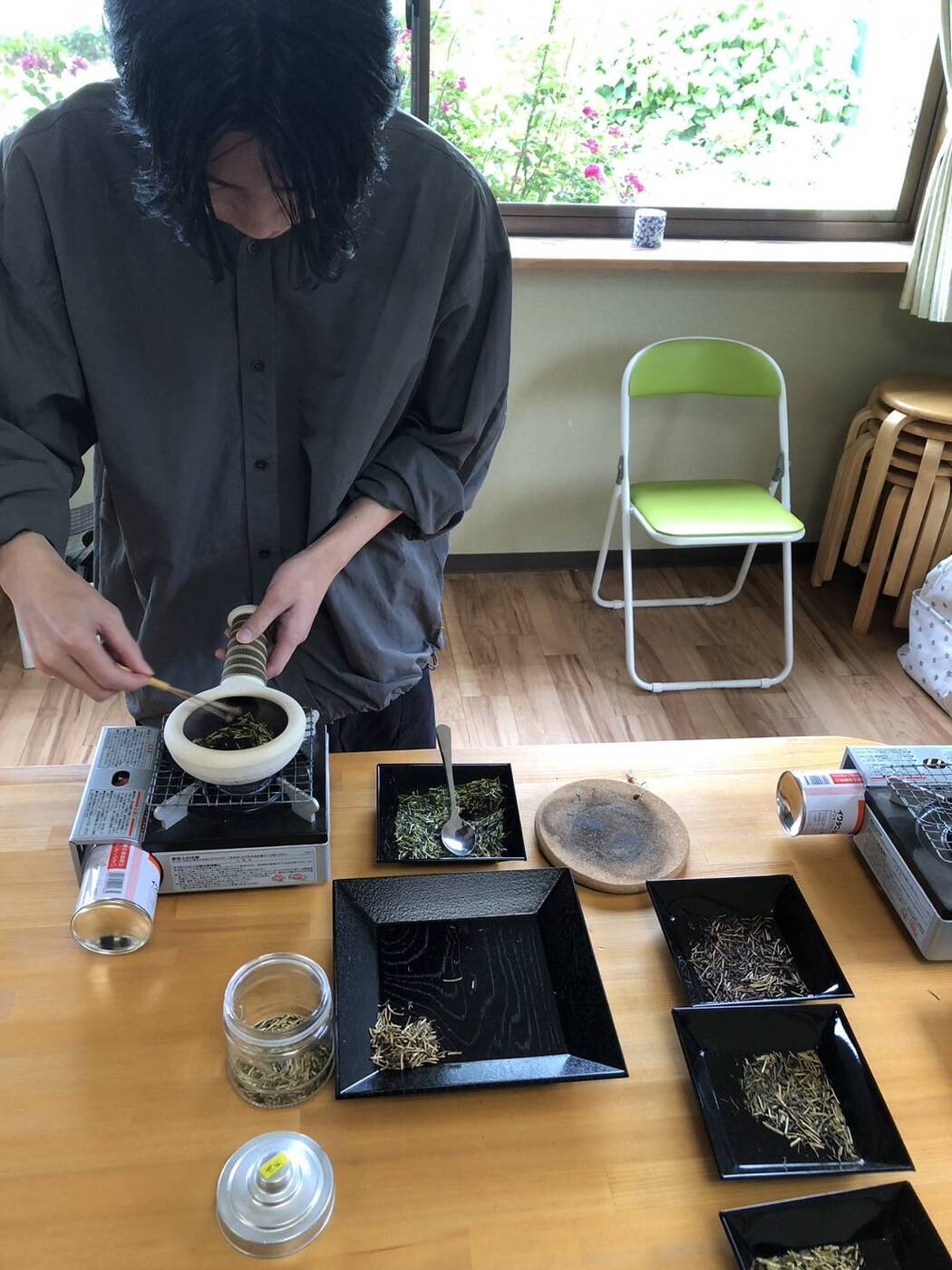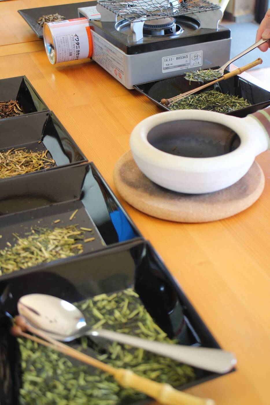 その後、焙烙(ほうろく)という専用の道具を使い、茶葉を丁寧に煎り上げます。火にかける時間を調整して、爽やかな「浅煎り」から香ばしさ際立つ「深煎り」まで、自分好みの味に仕上げます。