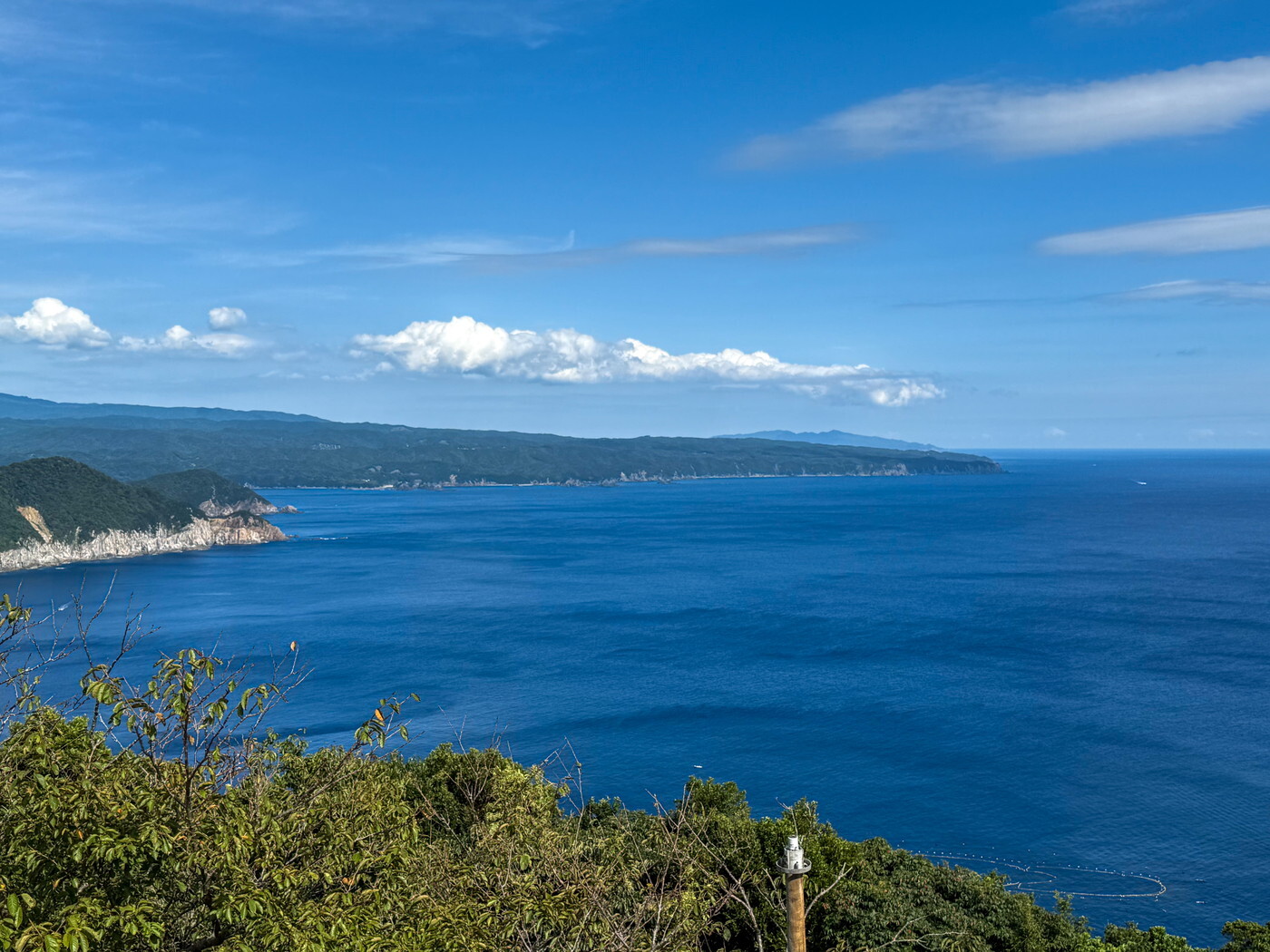 展望台からは、東に白い岩肌の断崖絶壁が続く大堂海岸、西に宿毛市の離島である沖の島や鵜来島、そして豊後水道の雄大な海景が広がります。南には果てしなく続く太平洋の水平線が望め、その360°に広がる絶景は訪れる人々を魅了してやみません。