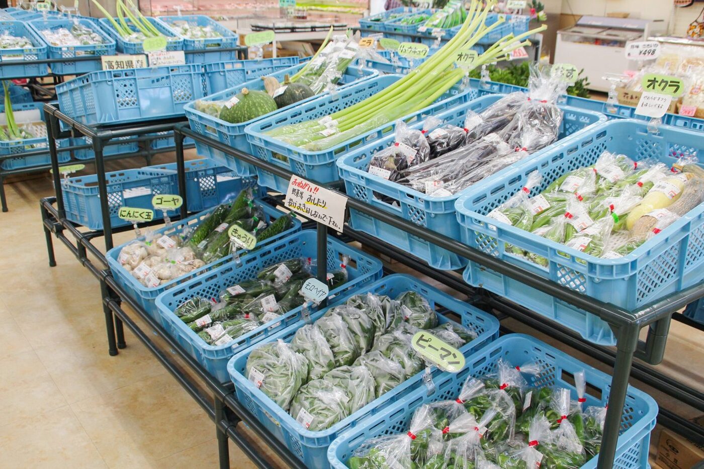 ナスやピーマン、ミョウガ、オクラなど旬の新鮮な野菜などが揃う直販所。