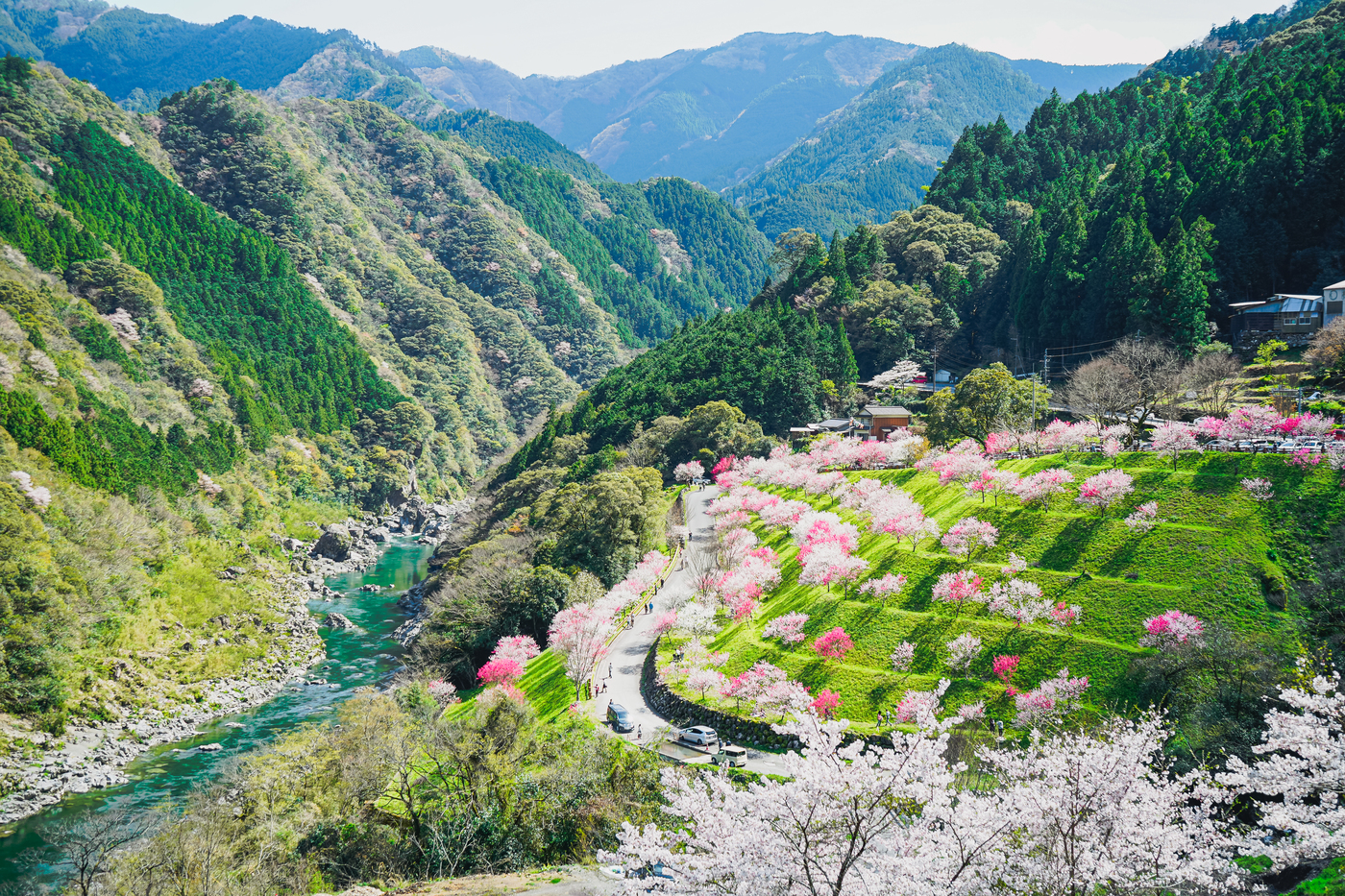 春になると、約100本の花桃の木が、白やピンクのかわいらしい花を咲かせます。すぐそばには仁淀川が流れています。