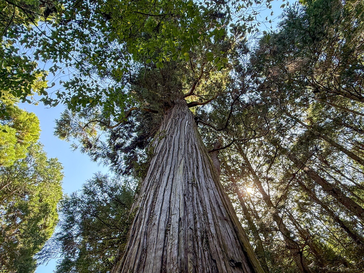 周辺のスギ・ヒノキ林を遥かに超える高さで、相当遠方からでもその姿を確認できます。かつて植物学者の中井猛之進博士が、小枝が細く垂れ下がる特徴から「コウチスギ」と変種命名したこともある、独特の樹形を持つ巨木です。