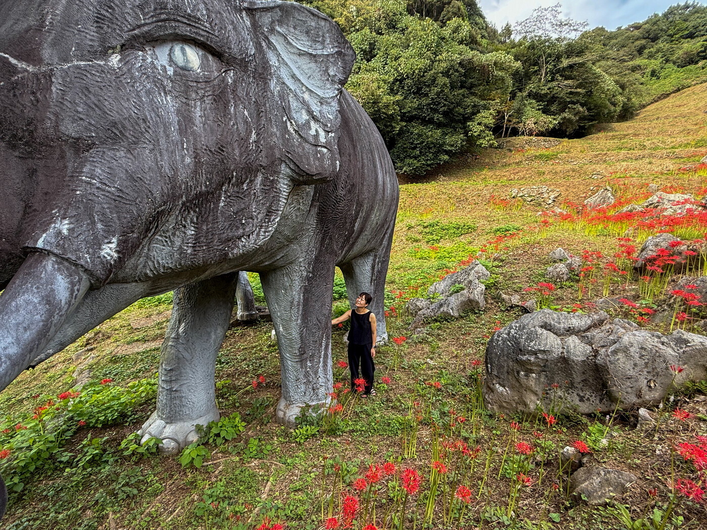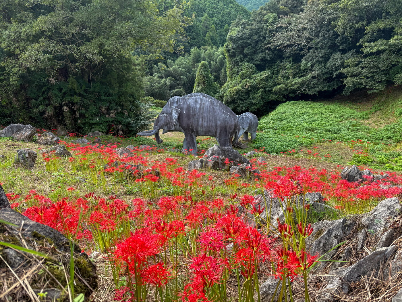 高知県佐川町ののどかな里山に広がるカルスト台地は、標高約160mの尾根から斜面中腹にかけて石灰岩が突出した独特の景観を持つスポットです。台地には巨大なナウマンゾウの親子オブジェが設置され、カルスト地形との不思議なコラボレーションが楽しめます。