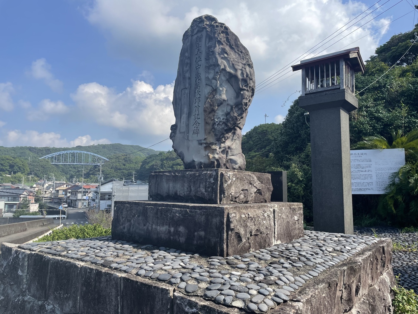 正五位が贈られた記念に出生地である土佐清水市に建てられた中濱萬次郎記念碑。米ひきの失敗を咎められて飛び出した先で、漁師になるきっかけとなる出会いがあったというエピソードから手前には石臼が置かれています。日本人として初めてアメリカに渡り、西洋の知識や情報を持ち帰った萬次郎は、当時の日本に多大な功績を残しました。
