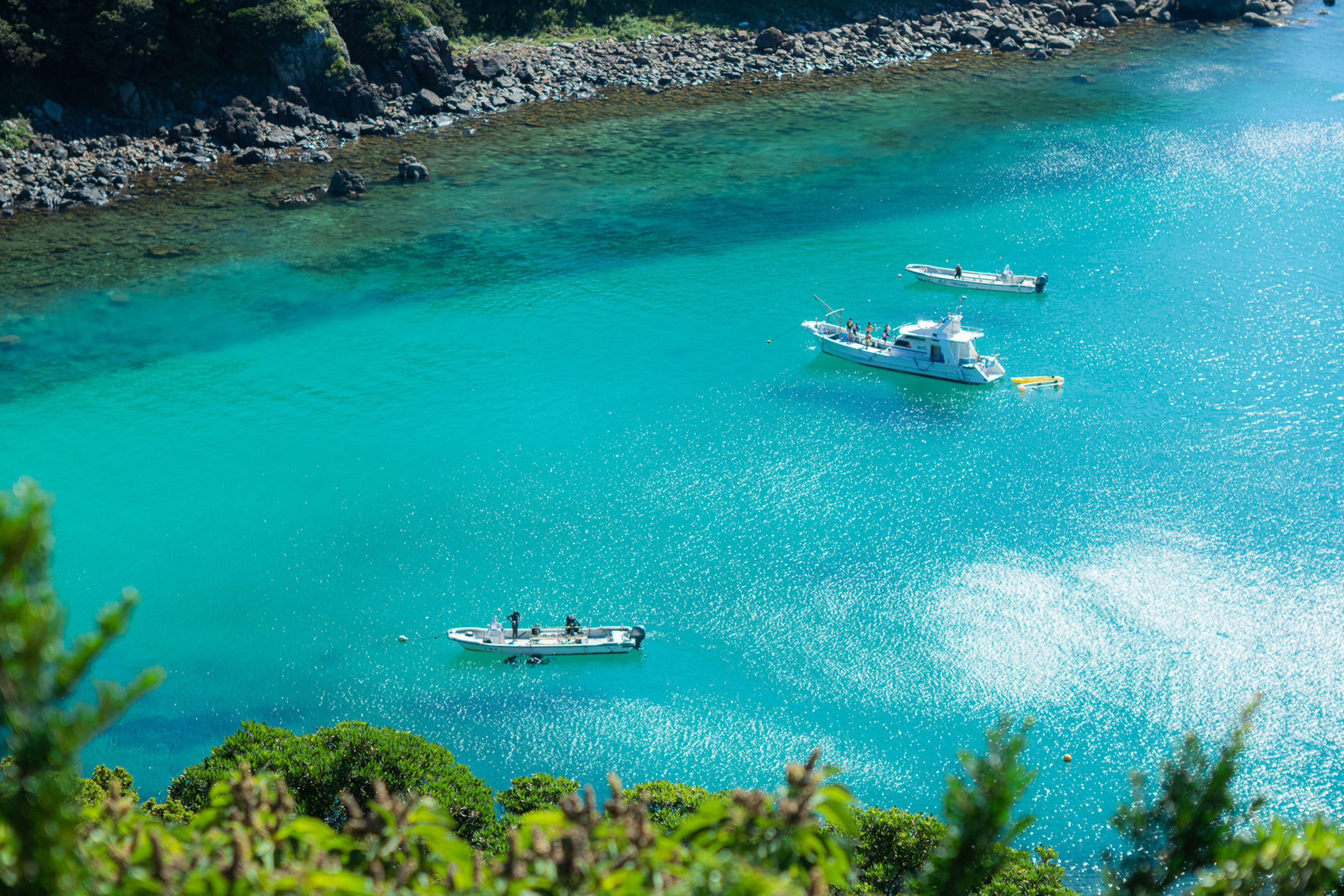 「柏島」の魅力は、何といっても高い透明度とエメラルドグリーン色をした美しい海。約1000種類の海洋生物が生息するこの幻想的な世界を冒険する「ダイビング」や「シュノーケリング」をはじめ、船上から海中の様子を楽しめる「グラスボート」など、ここでしか味わえないマリンアクティビティが多数楽しめます。